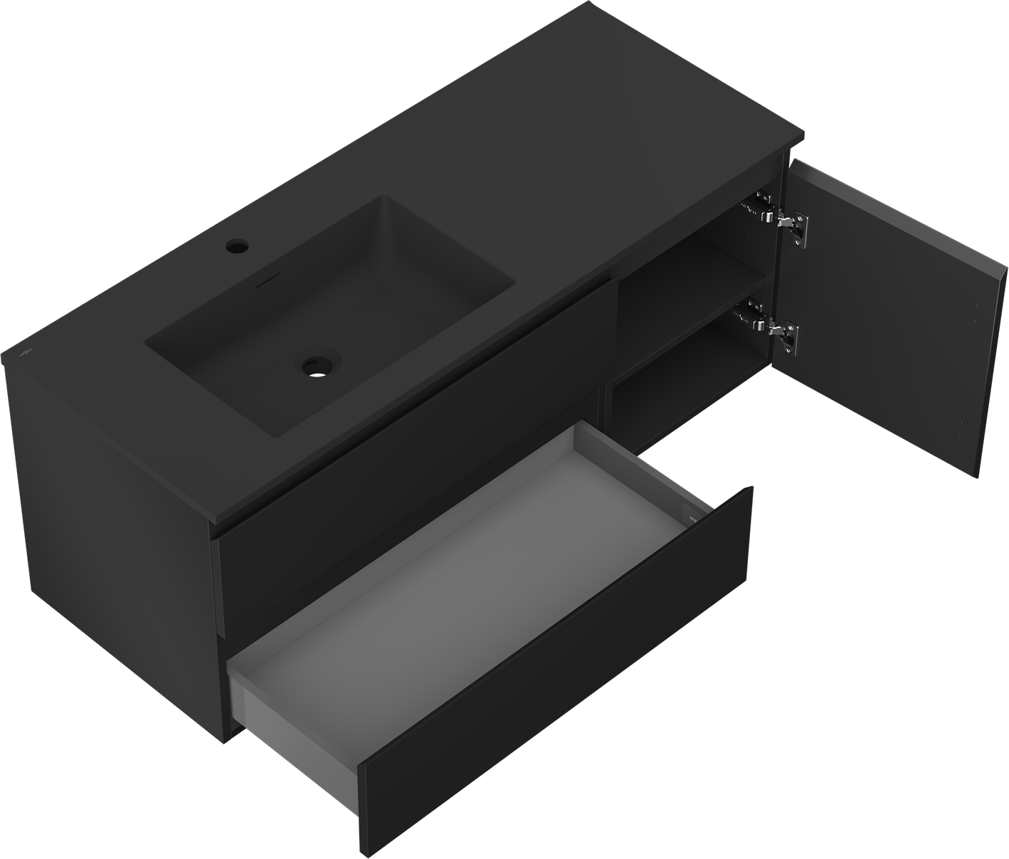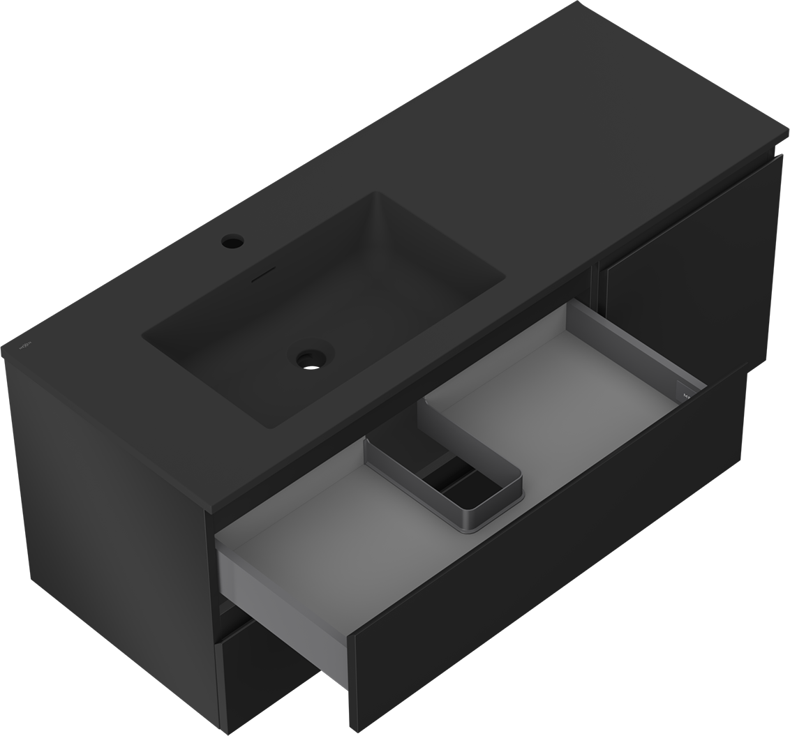Decupajul în sertar este proiectat în așa fel încât să acomodeze sifonul, care este esențial în instalațiile de lavoare. Datorită acestui fapt, mobila poate fi montată complet funcțională, fără a fi necesară renunțarea la spațiul din sertar în favoarea instalației.