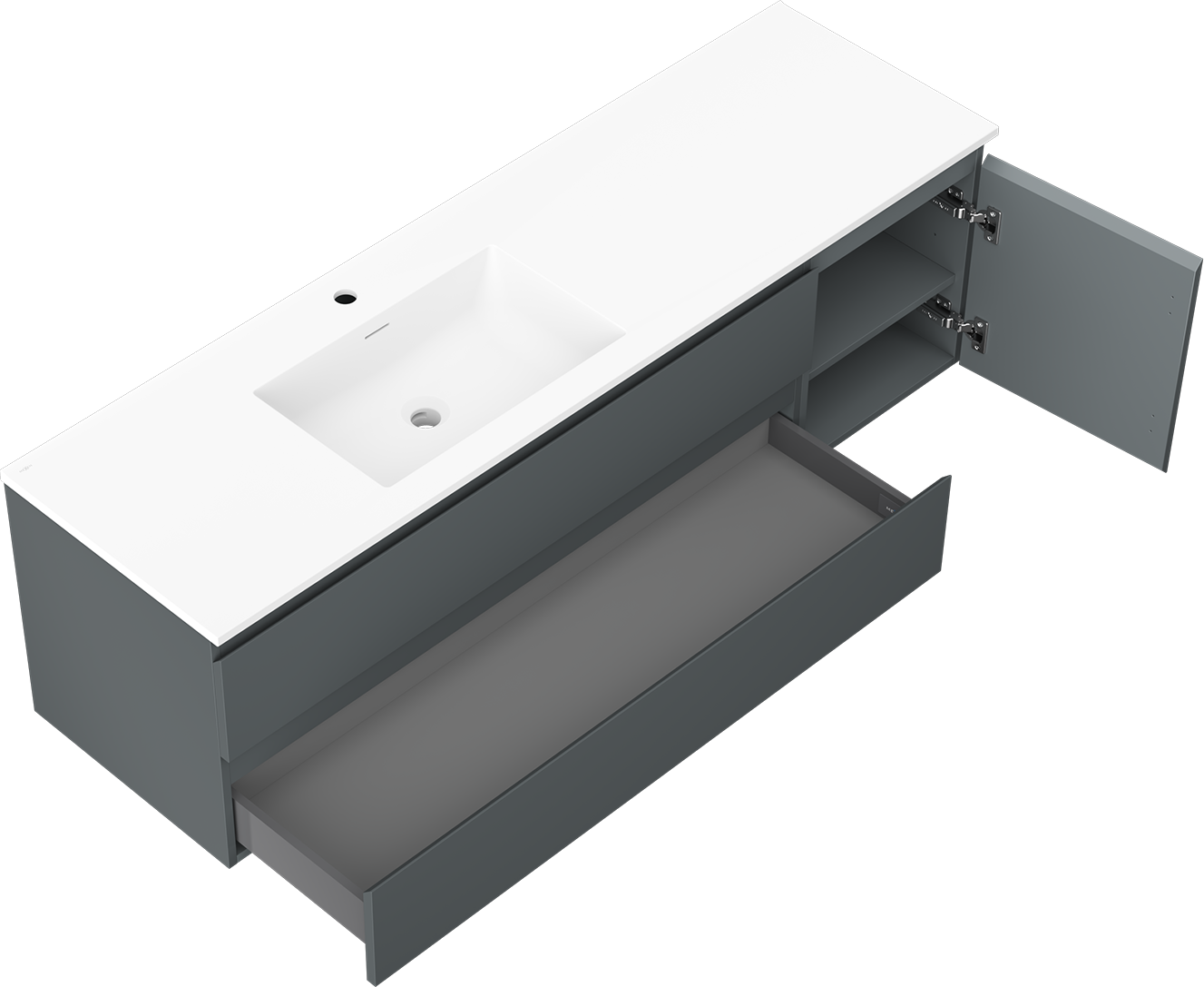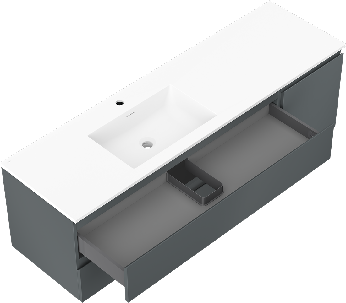 Decupajul în sertar este proiectat în așa fel încât să acomodeze sifonul, care este esențial în instalațiile de lavoare. Datorită acestui fapt, mobila poate fi montată complet funcțională, fără a fi necesară renunțarea la spațiul din sertar în favoarea instalației.