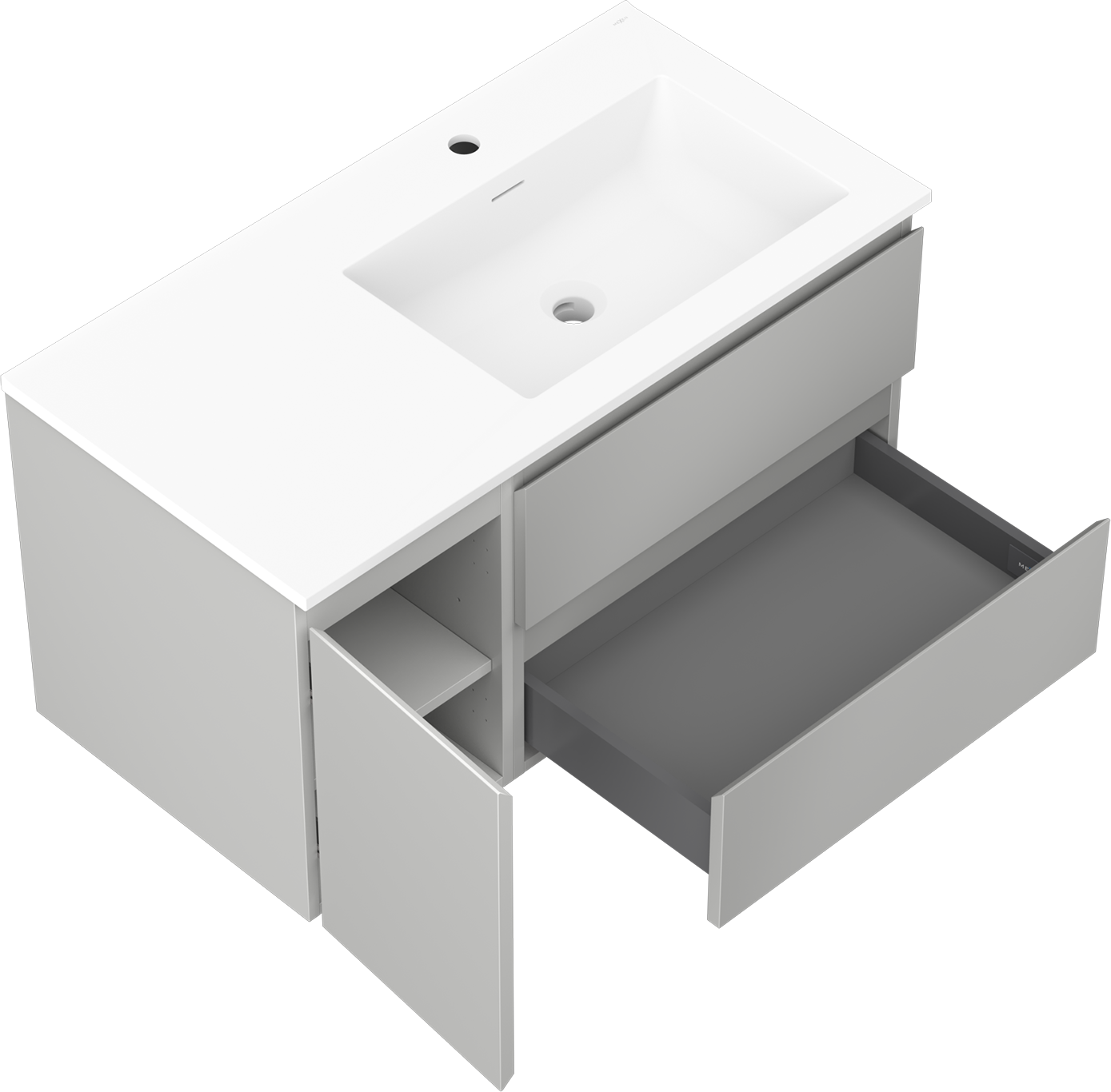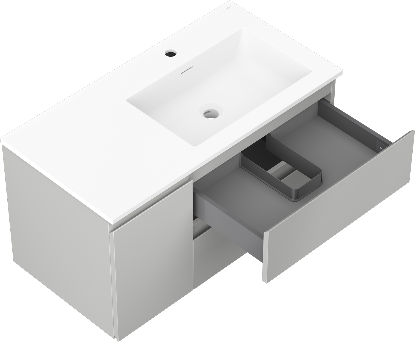 Decupajul în sertar este proiectat în așa fel încât să acomodeze sifonul, care este esențial în instalațiile de lavoare. Datorită acestui fapt, mobila poate fi montată complet funcțională, fără a fi necesară renunțarea la spațiul din sertar în favoarea instalației.