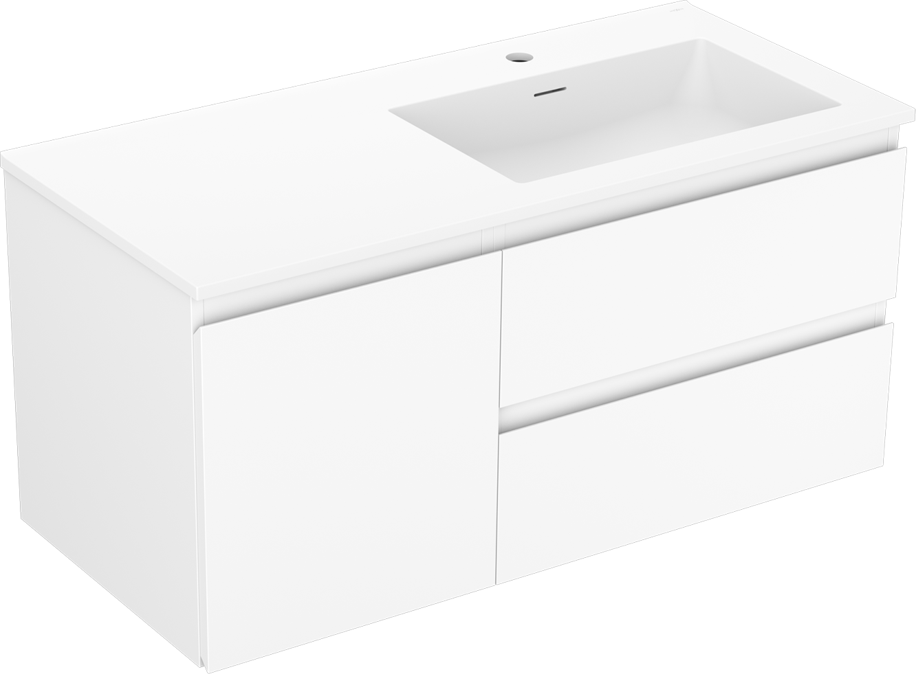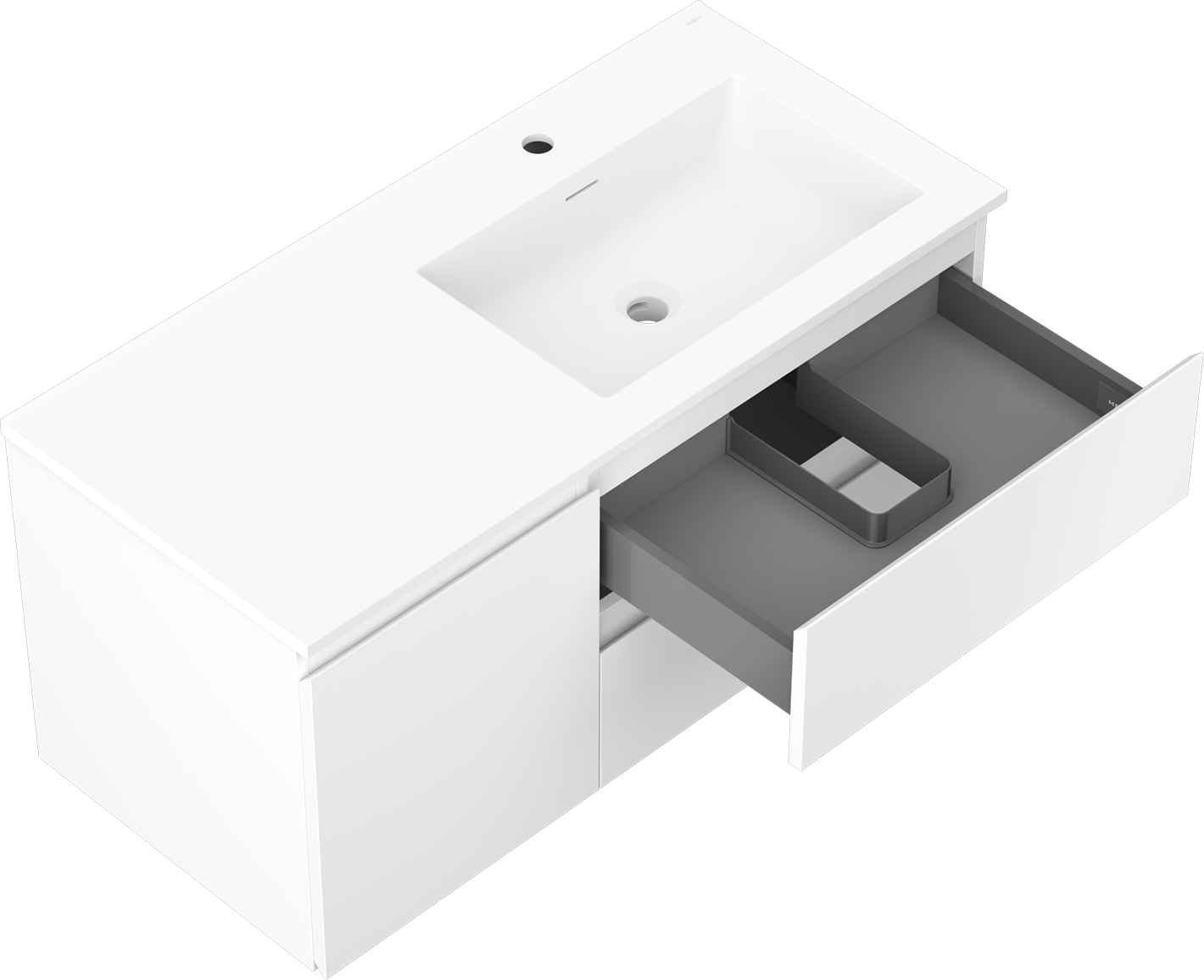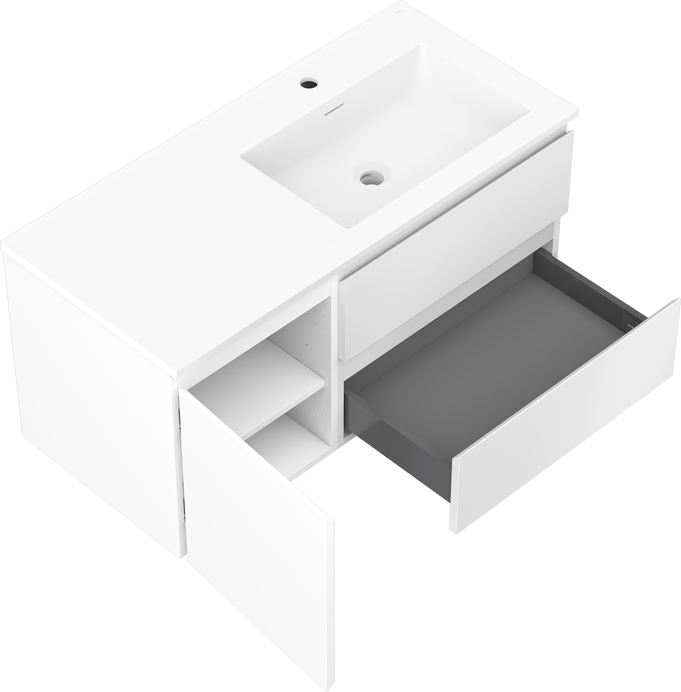 Decupajul în sertar este proiectat în așa fel încât să acomodeze sifonul, care este esențial în instalațiile de lavoare. Datorită acestui fapt, mobila poate fi montată complet funcțională, fără a fi necesară renunțarea la spațiul din sertar în favoarea instalației.