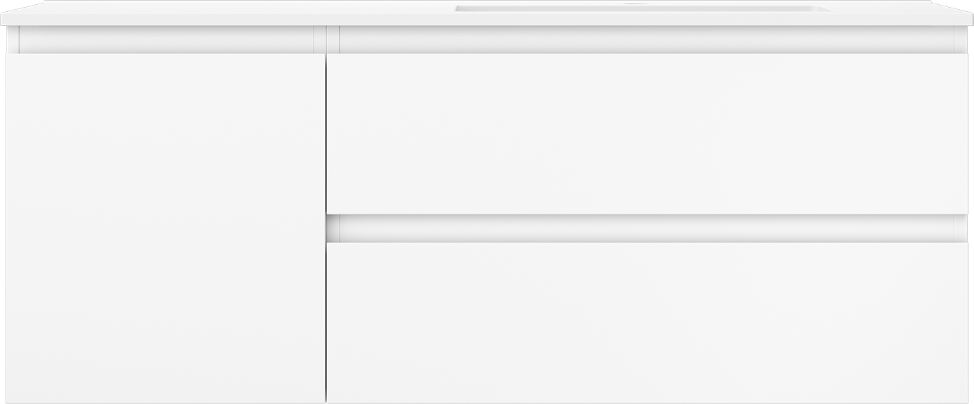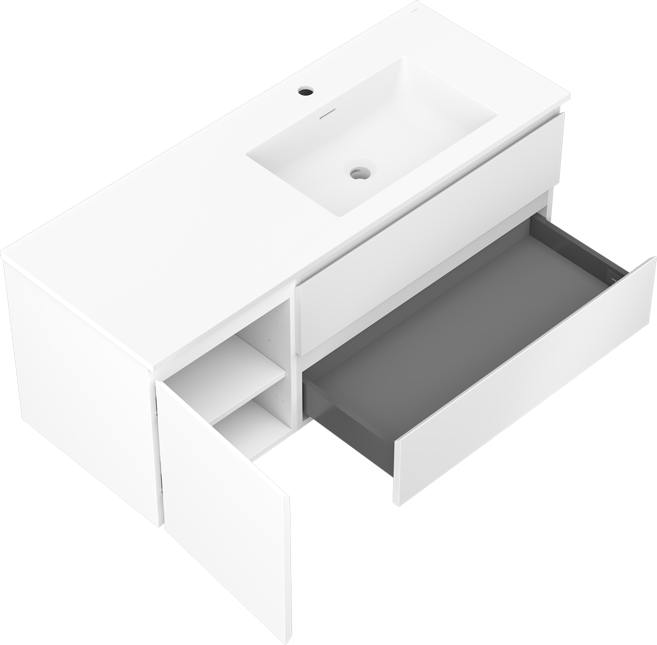Decupajul în sertar este proiectat în așa fel încât să acomodeze sifonul, care este esențial în instalațiile de lavoare. Datorită acestui fapt, mobila poate fi montată complet funcțională, fără a fi necesară renunțarea la spațiul din sertar în favoarea instalației.