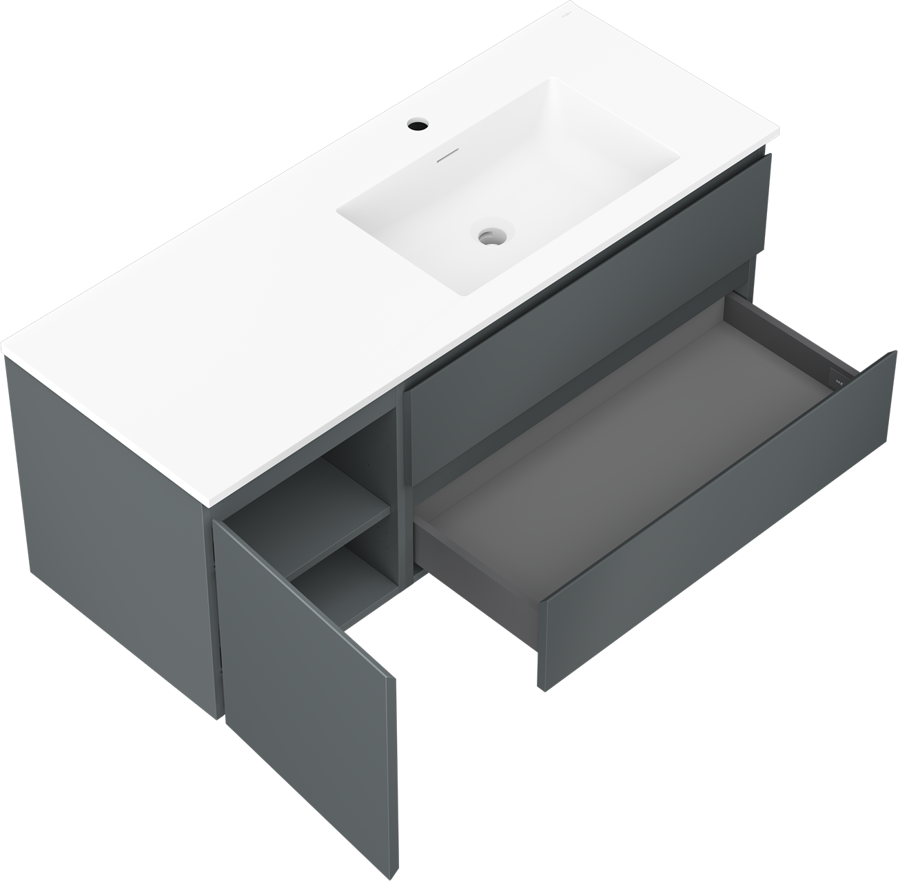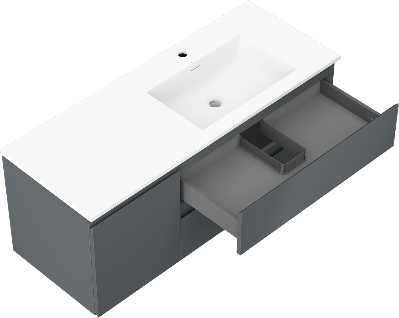 Decupajul în sertar este proiectat în așa fel încât să acomodeze sifonul, care este esențial în instalațiile de lavoare. Datorită acestui fapt, mobila poate fi montată complet funcțională, fără a fi necesară renunțarea la spațiul din sertar în favoarea instalației.