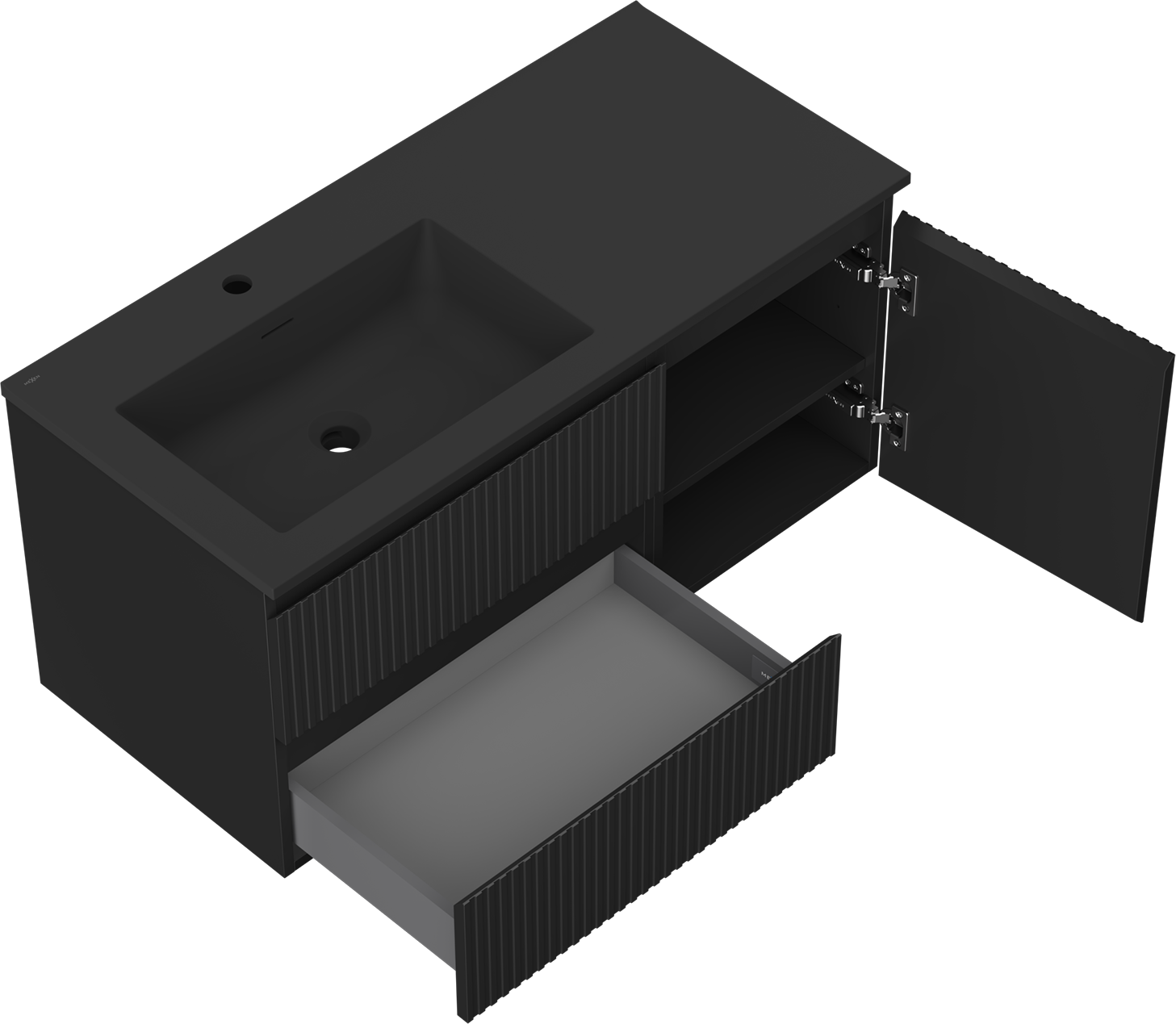 Decupajul în sertar este proiectat în așa fel încât să acomodeze sifonul, care este esențial în instalațiile de lavoare. Datorită acestui fapt, mobila poate fi montată complet funcțională, fără a fi necesară renunțarea la spațiul din sertar în favoarea instalației.