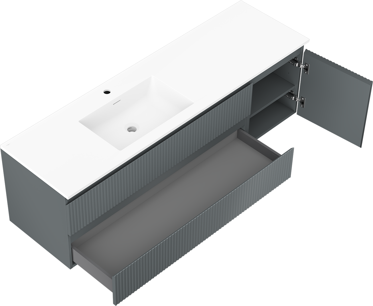 Decupajul în sertar este proiectat în așa fel încât să acomodeze sifonul, care este esențial în instalațiile de lavoare. Datorită acestui fapt, mobila poate fi montată complet funcțională, fără a fi necesară renunțarea la spațiul din sertar în favoarea instalației.