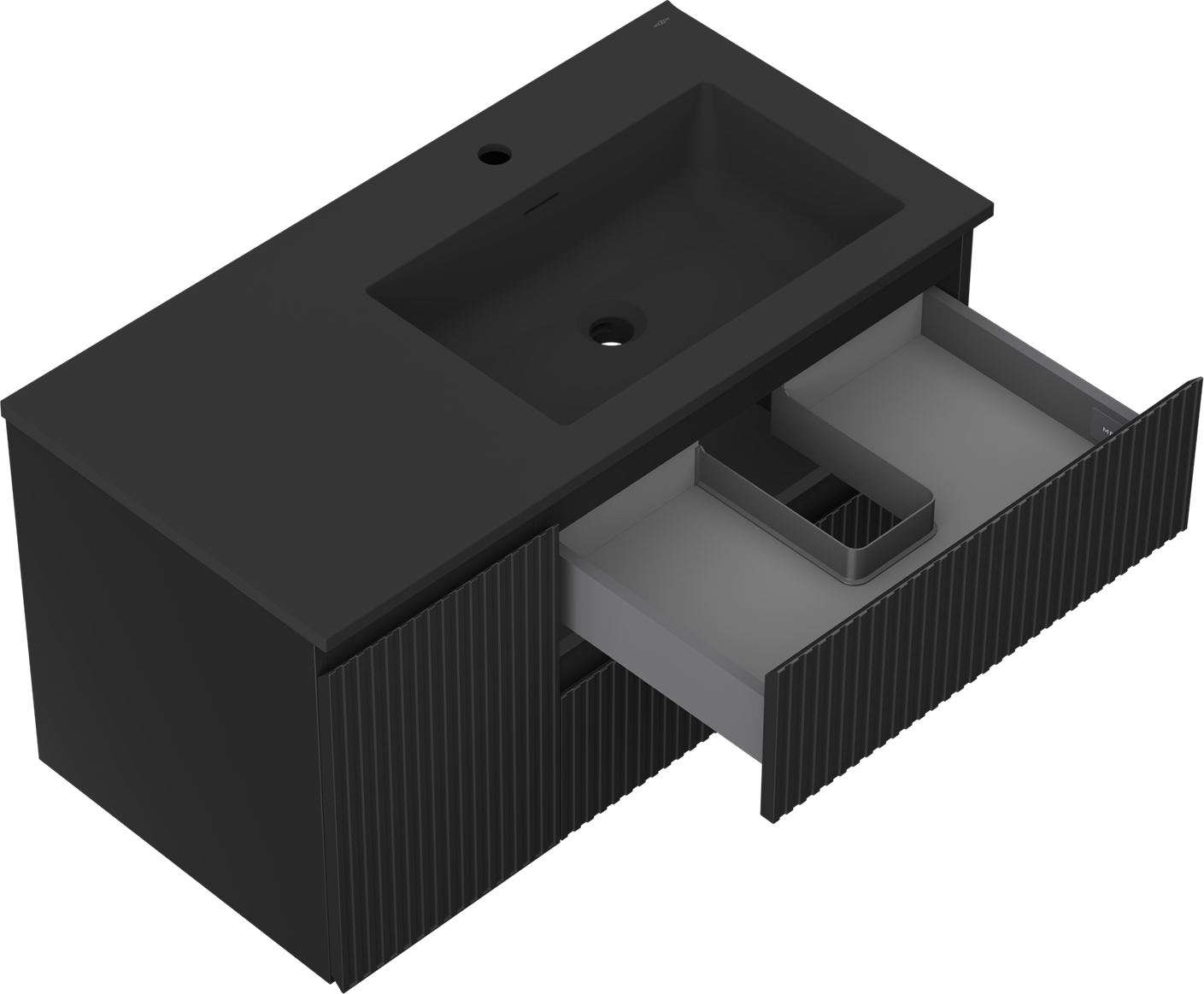 Decupajul în sertar este proiectat în așa fel încât să acomodeze sifonul, care este esențial în instalațiile de lavoare. Datorită acestui fapt, mobila poate fi montată complet funcțională, fără a fi necesară renunțarea la spațiul din sertar în favoarea instalației.