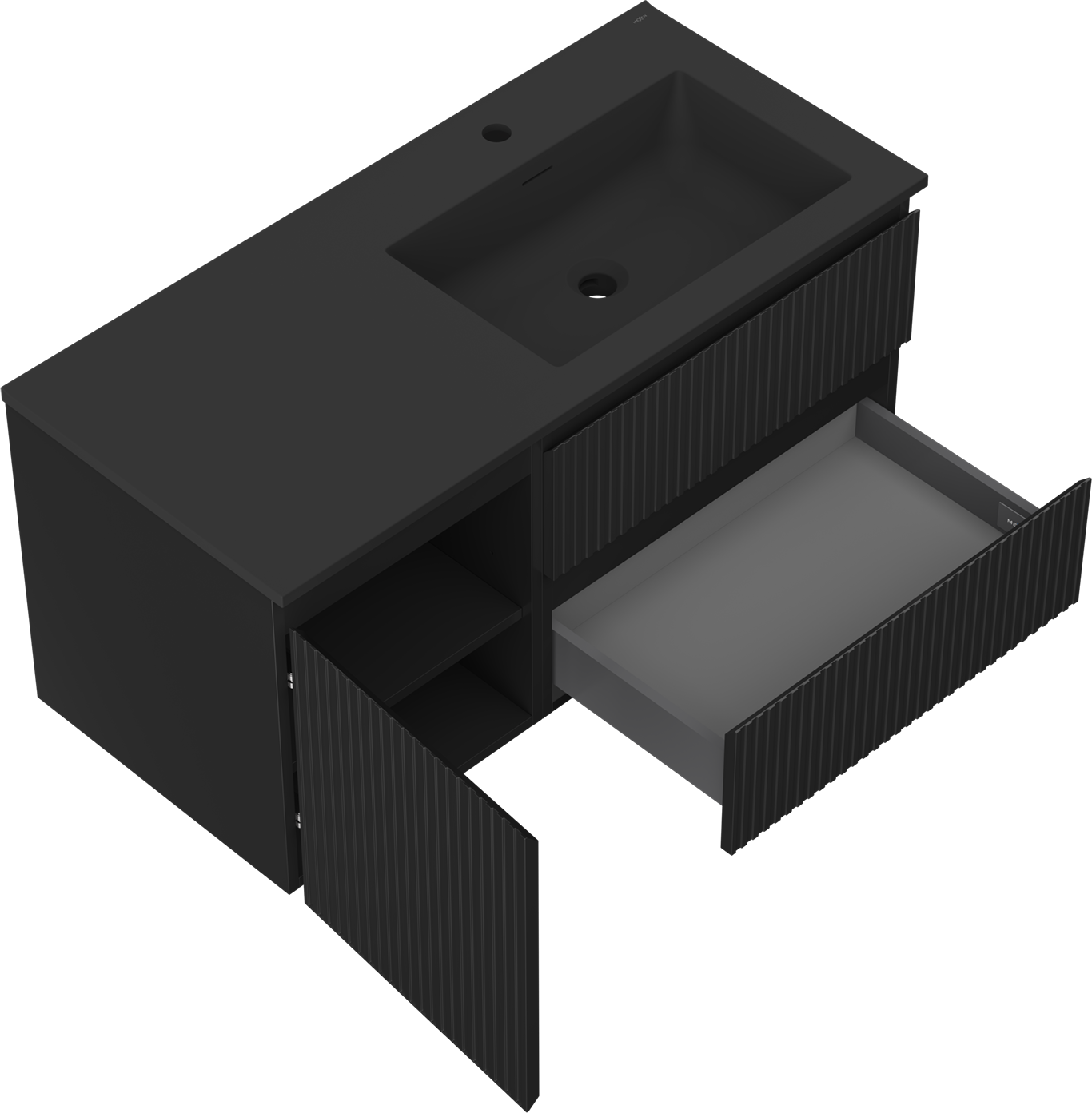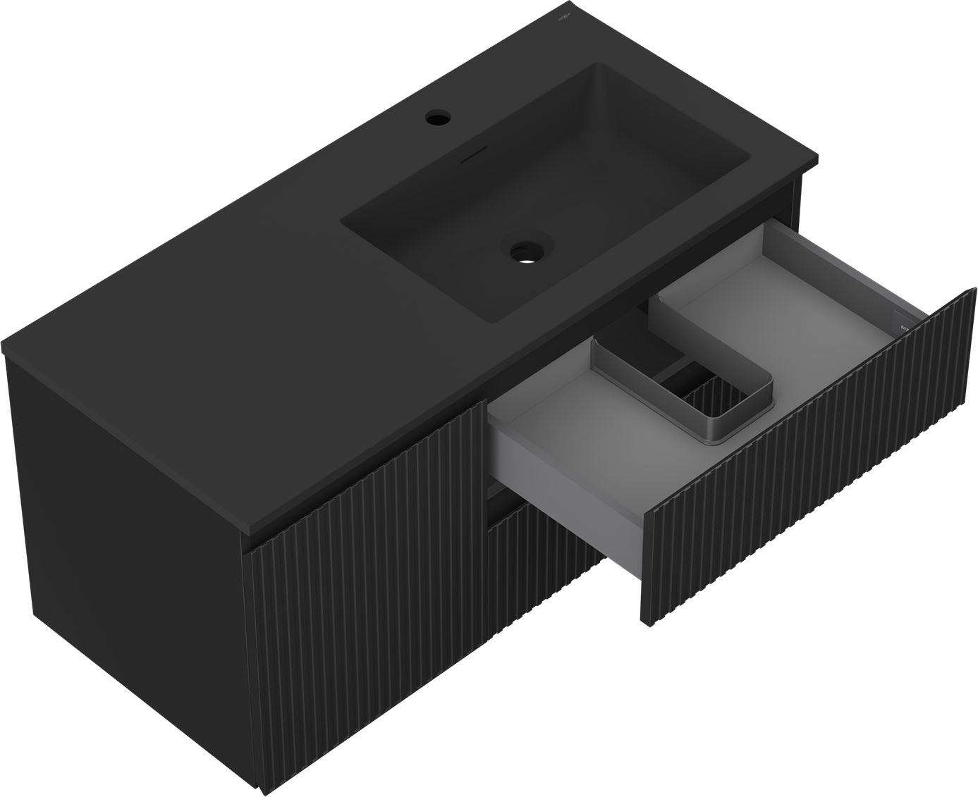 Decupajul în sertar este proiectat în așa fel încât să acomodeze sifonul, care este esențial în instalațiile de lavoare. Datorită acestui fapt, mobila poate fi montată complet funcțională, fără a fi necesară renunțarea la spațiul din sertar în favoarea instalației.