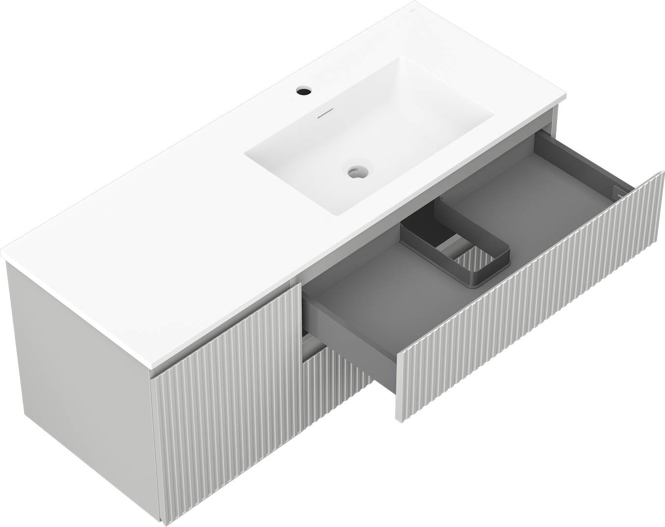Decupajul în sertar este proiectat în așa fel încât să acomodeze sifonul, care este esențial în instalațiile de lavoare. Datorită acestui fapt, mobila poate fi montată complet funcțională, fără a fi necesară renunțarea la spațiul din sertar în favoarea instalației.
