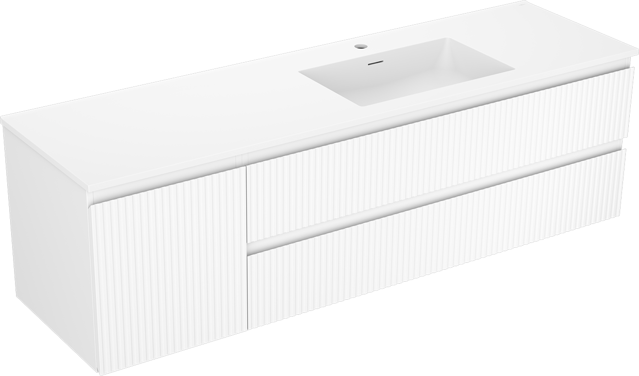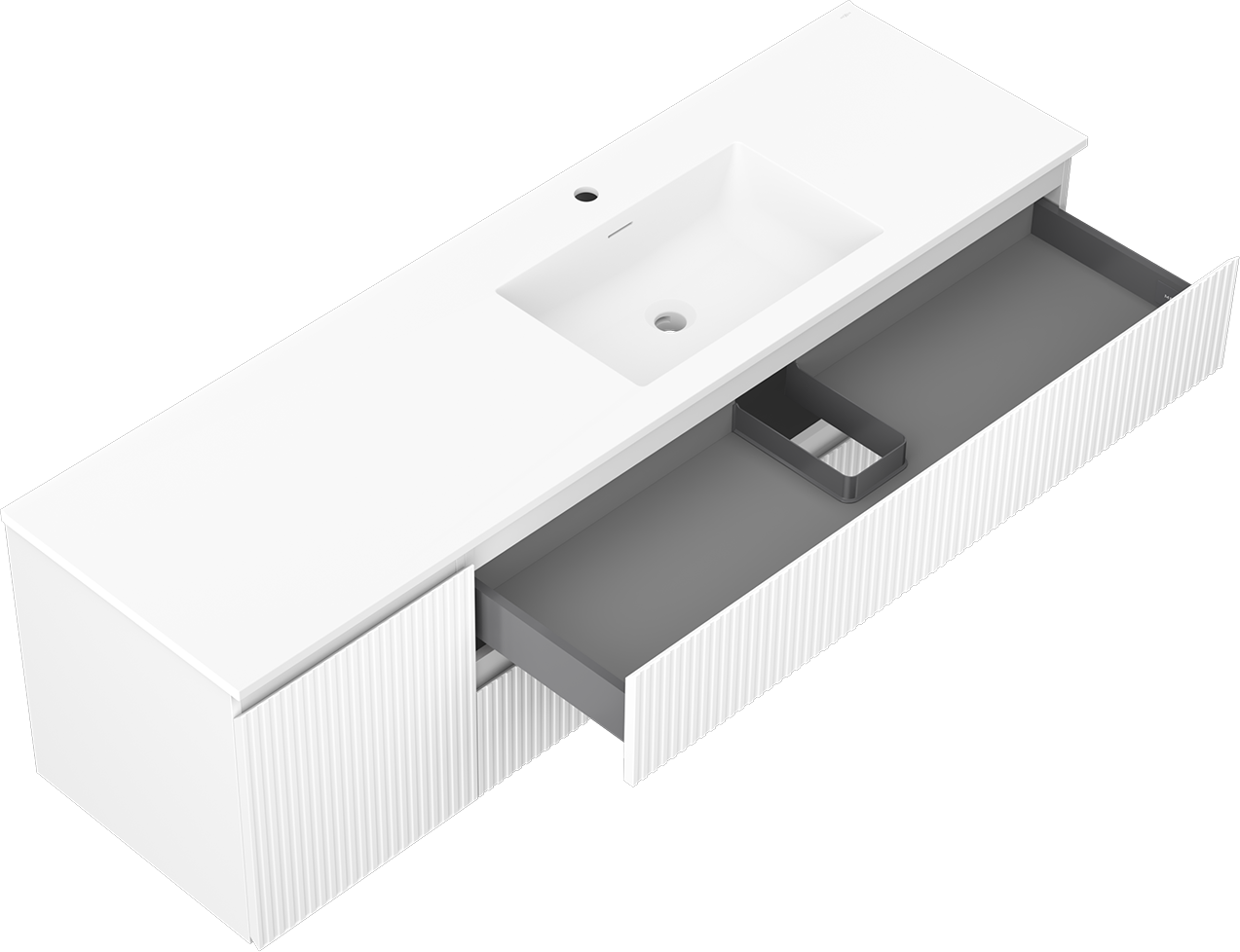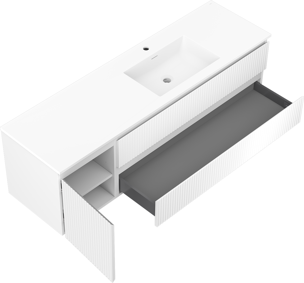 Decupajul în sertar este proiectat în așa fel încât să acomodeze sifonul, care este esențial în instalațiile de lavoare. Datorită acestui fapt, mobila poate fi montată complet funcțională, fără a fi necesară renunțarea la spațiul din sertar în favoarea instalației.