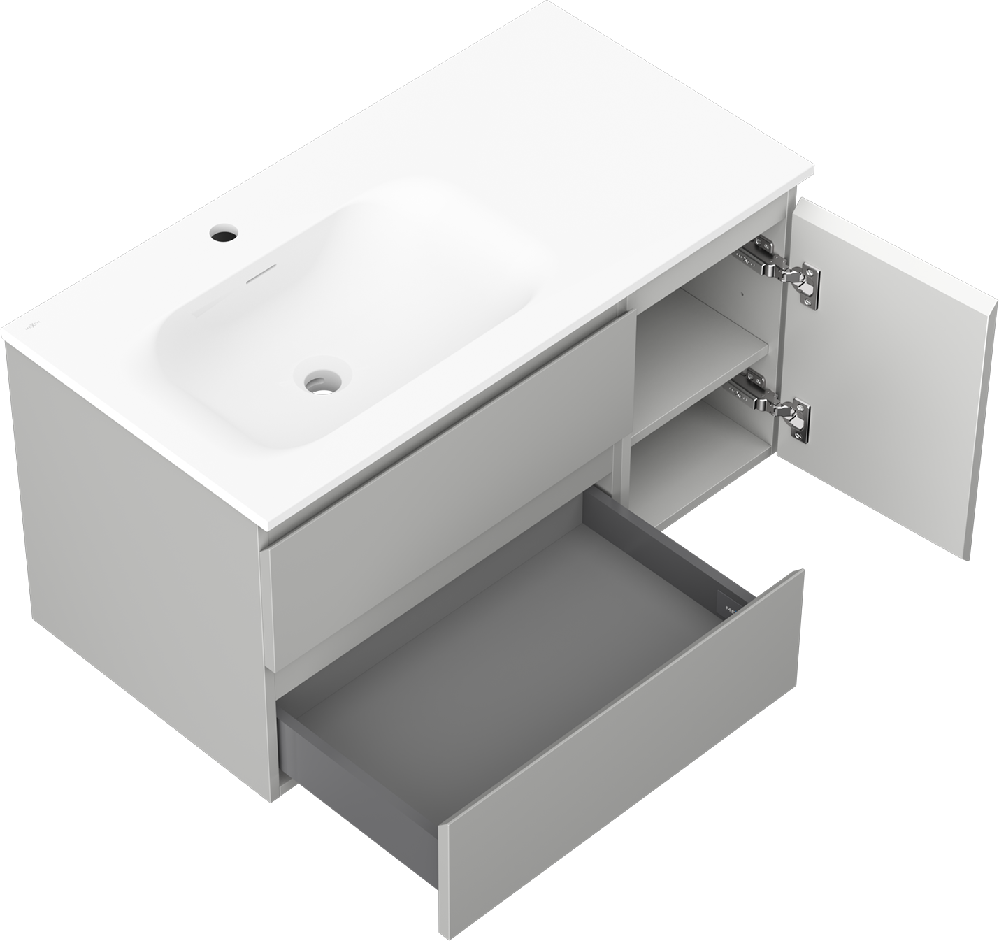 Decupajul în sertar este proiectat în așa fel încât să acomodeze sifonul, care este esențial în instalațiile de lavoare. Datorită acestui fapt, mobila poate fi montată complet funcțională, fără a fi necesară renunțarea la spațiul din sertar în favoarea instalației.