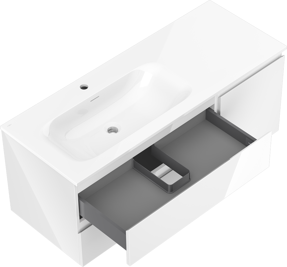 Decupajul în sertar este proiectat în așa fel încât să acomodeze sifonul, care este esențial în instalațiile de lavoare. Datorită acestui fapt, mobila poate fi montată complet funcțională, fără a fi necesară renunțarea la spațiul din sertar în favoarea instalației.