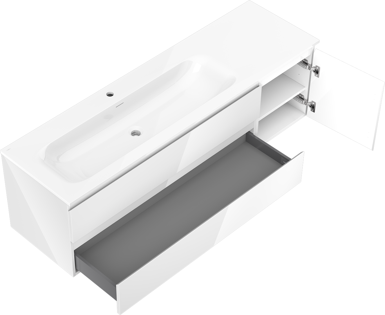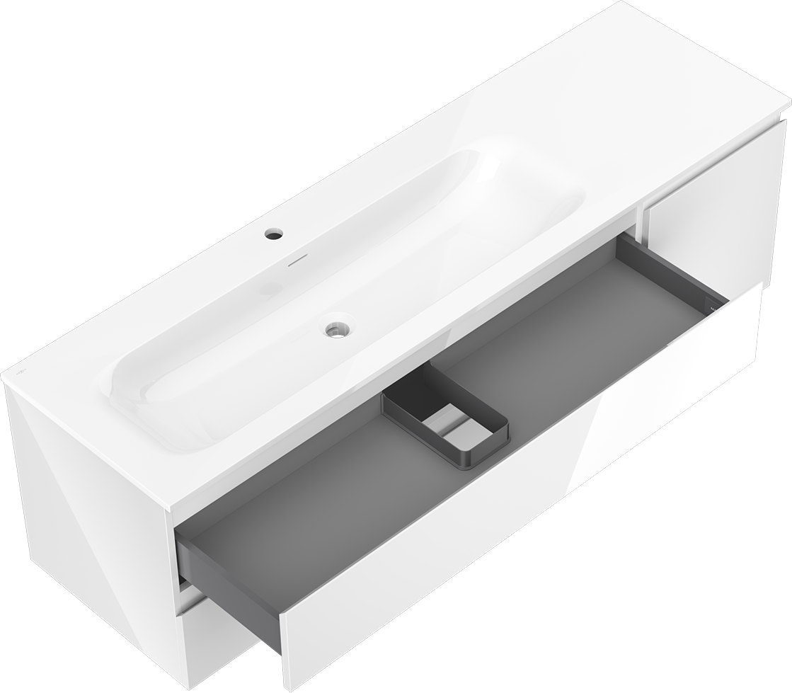 Decupajul în sertar este proiectat în așa fel încât să acomodeze sifonul, care este esențial în instalațiile de lavoare. Datorită acestui fapt, mobila poate fi montată complet funcțională, fără a fi necesară renunțarea la spațiul din sertar în favoarea instalației.