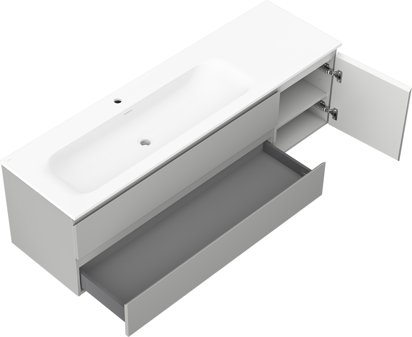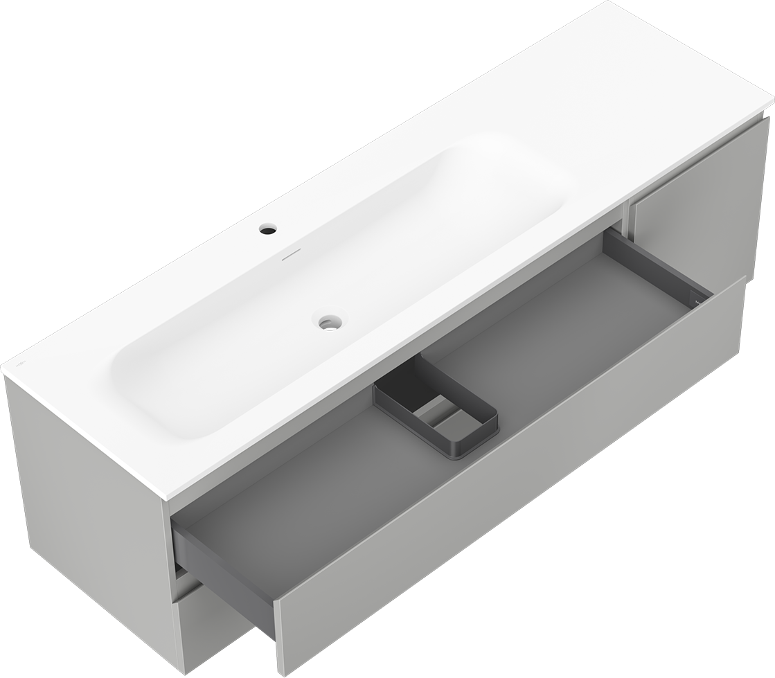 Decupajul în sertar este proiectat în așa fel încât să acomodeze sifonul, care este esențial în instalațiile de lavoare. Datorită acestui fapt, mobila poate fi montată complet funcțională, fără a fi necesară renunțarea la spațiul din sertar în favoarea instalației.