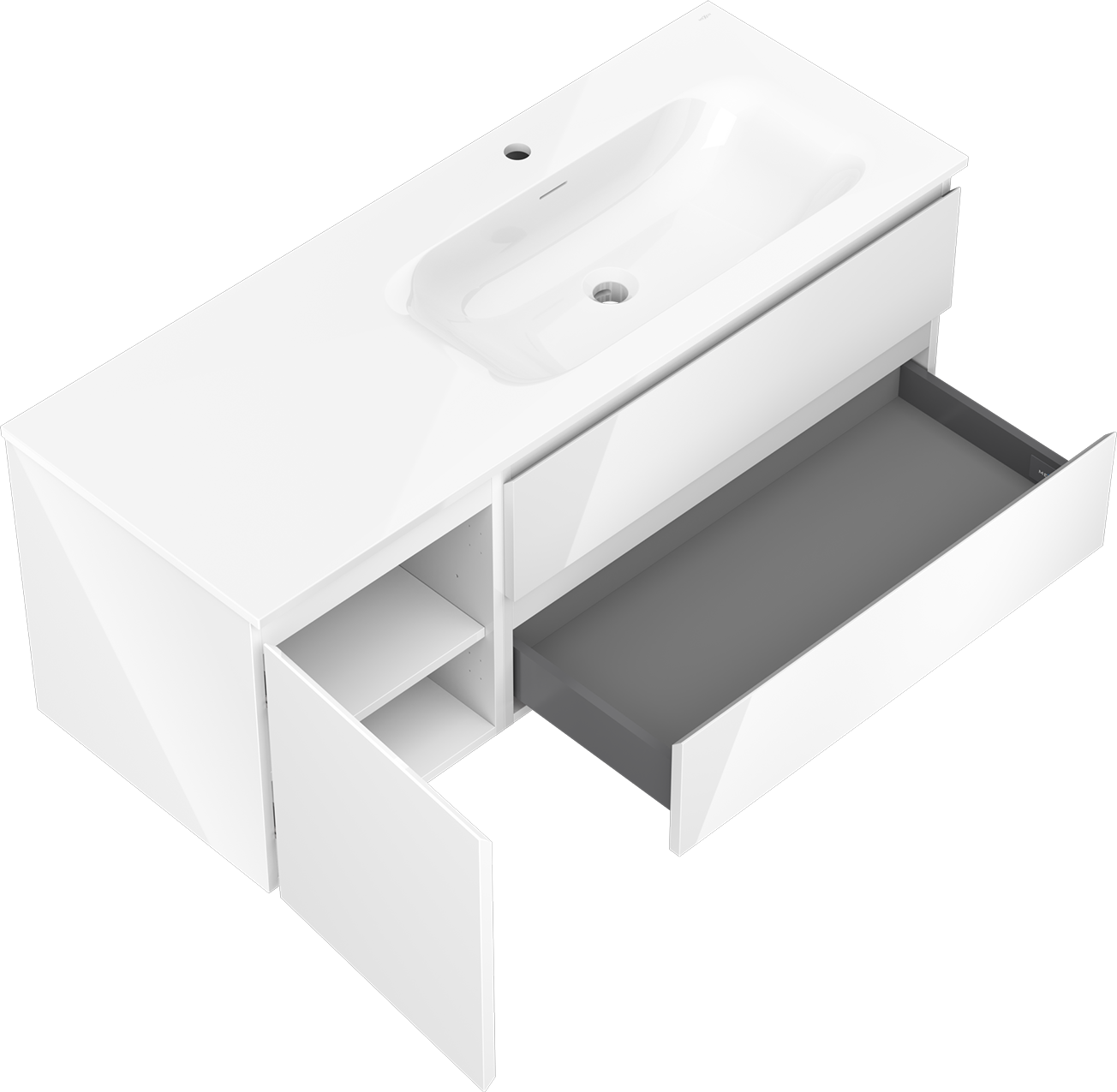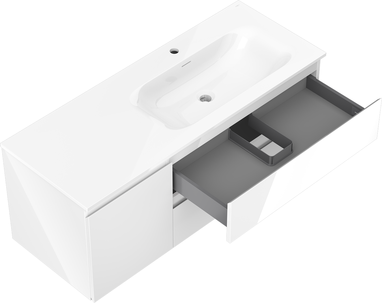 Decupajul în sertar este proiectat în așa fel încât să acomodeze sifonul, care este esențial în instalațiile de lavoare. Datorită acestui fapt, mobila poate fi montată complet funcțională, fără a fi necesară renunțarea la spațiul din sertar în favoarea instalației.