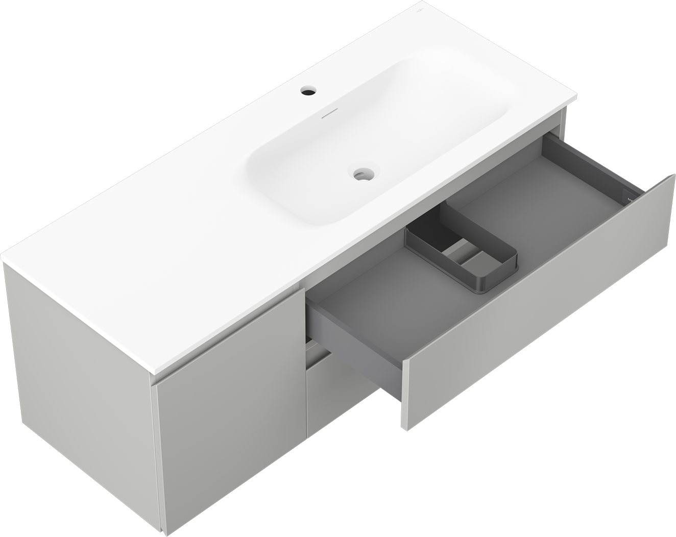 Decupajul în sertar este proiectat în așa fel încât să acomodeze sifonul, care este esențial în instalațiile de lavoare. Datorită acestui fapt, mobila poate fi montată complet funcțională, fără a fi necesară renunțarea la spațiul din sertar în favoarea instalației.