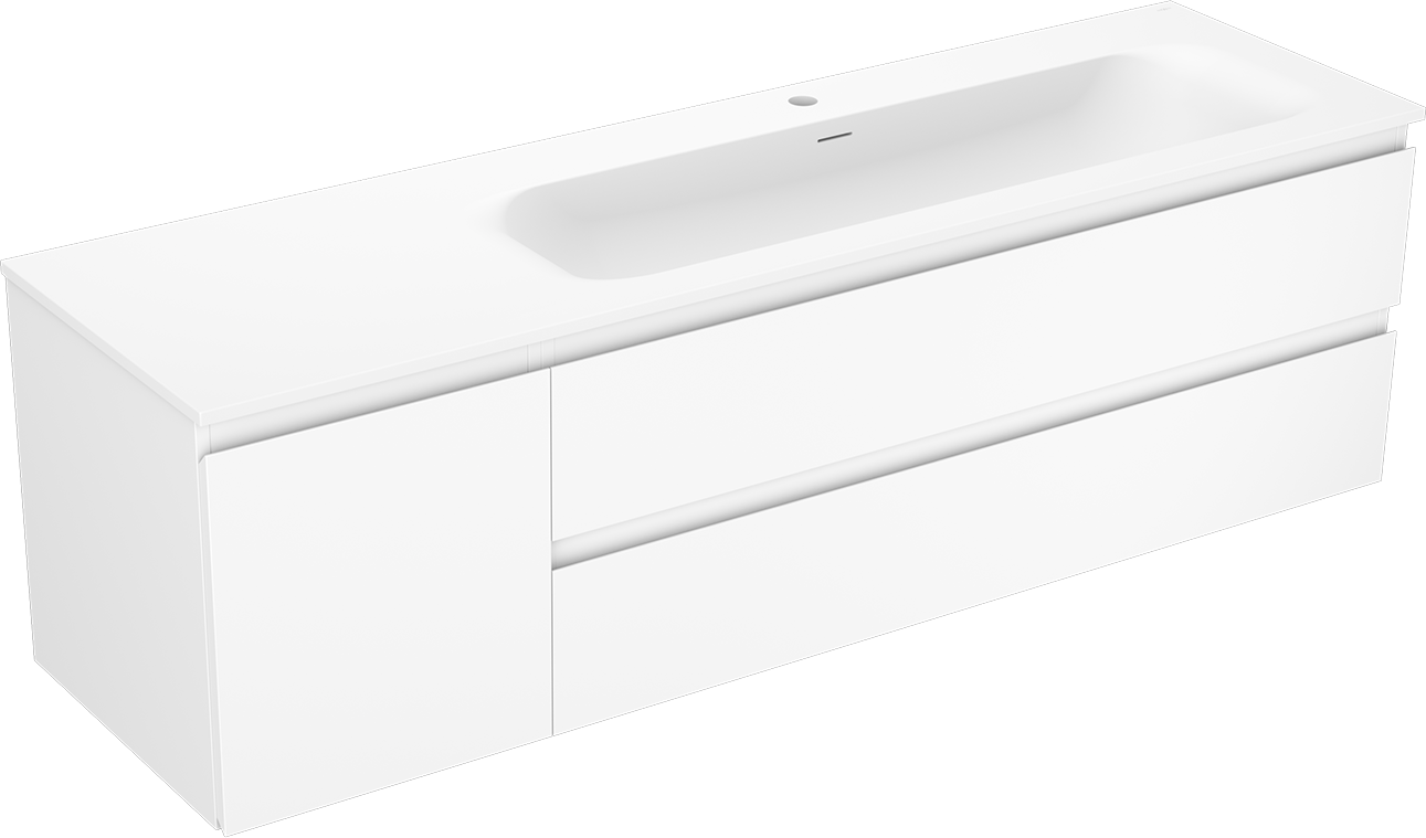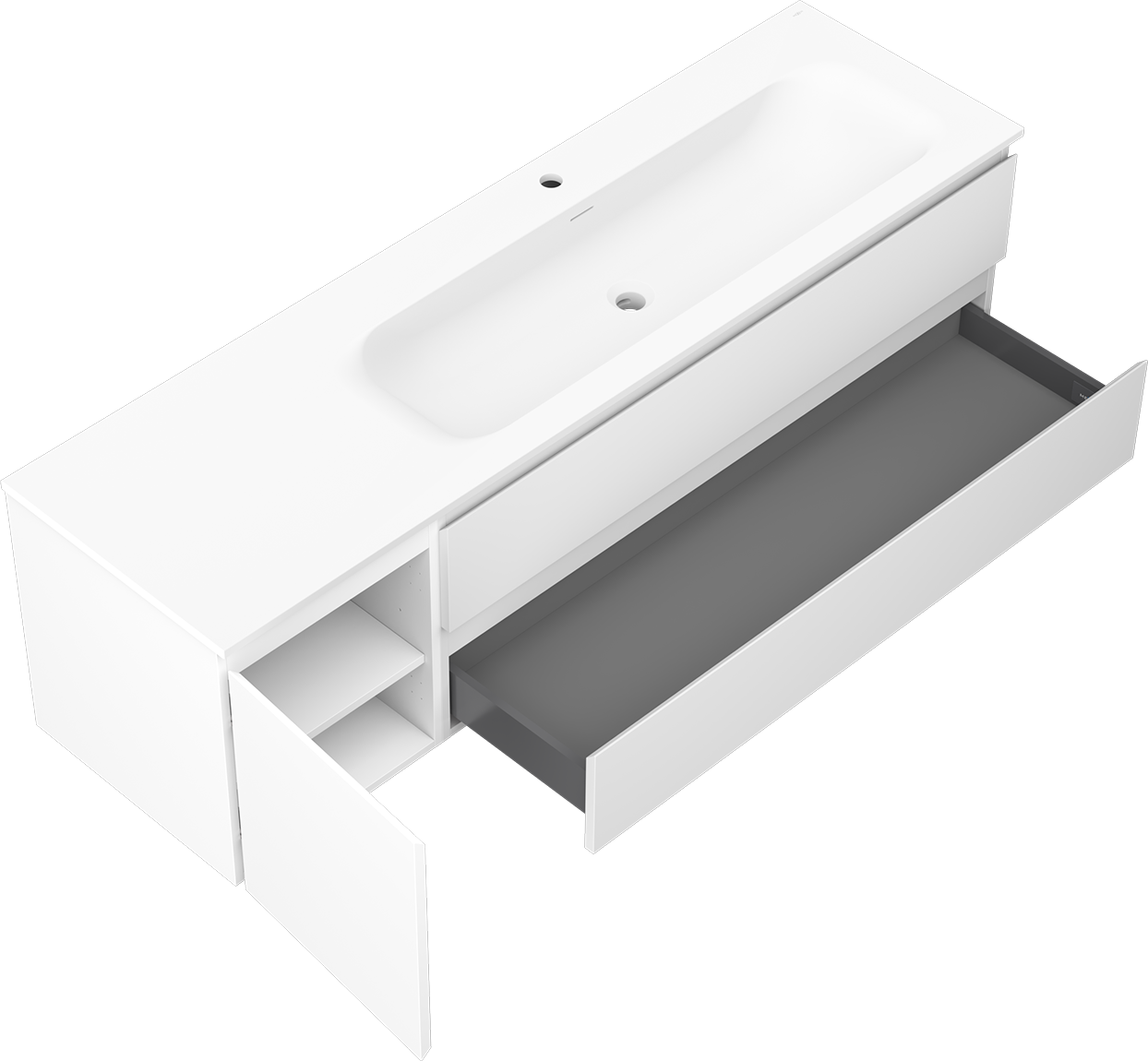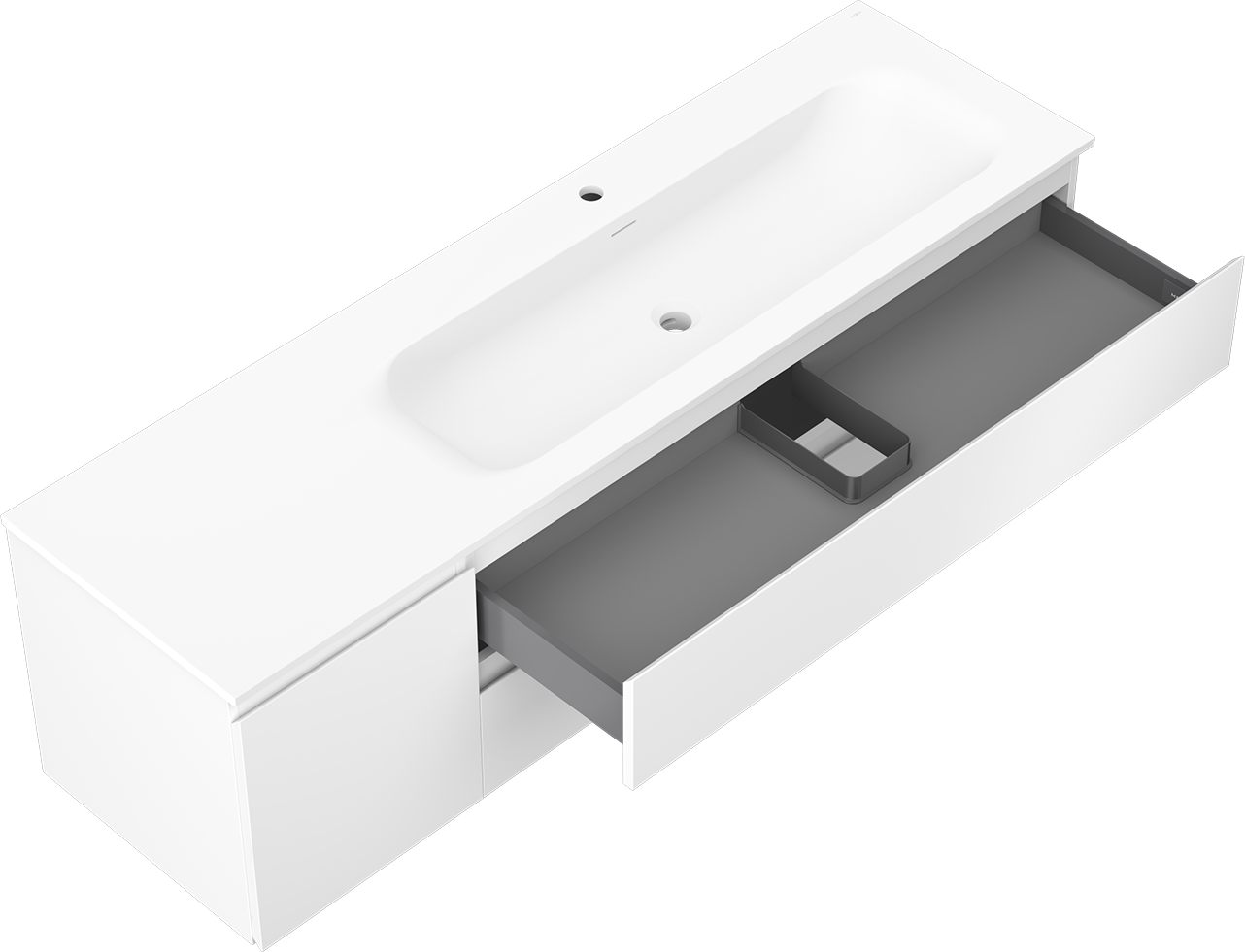 Decupajul în sertar este proiectat în așa fel încât să acomodeze sifonul, care este esențial în instalațiile de lavoare. Datorită acestui fapt, mobila poate fi montată complet funcțională, fără a fi necesară renunțarea la spațiul din sertar în favoarea instalației.
