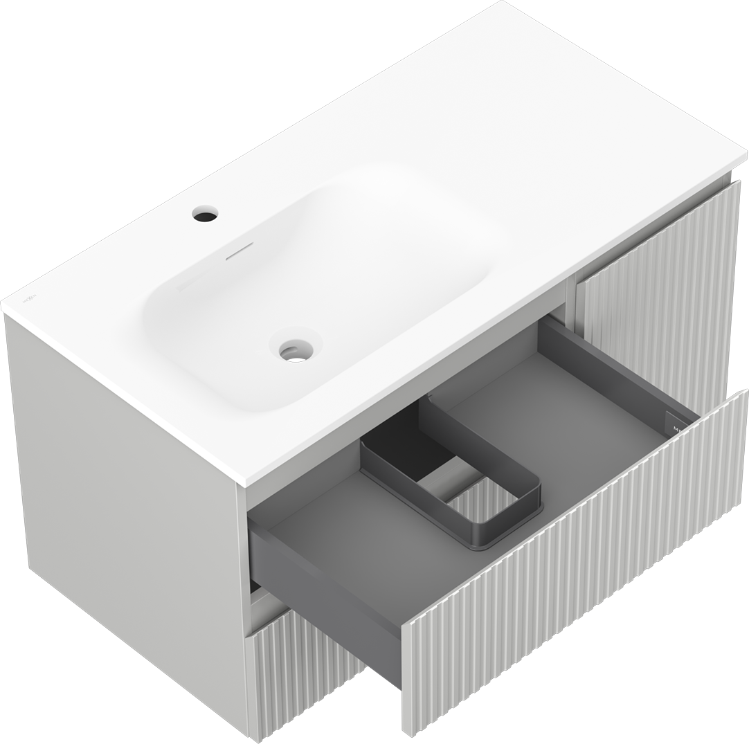 Decupajul în sertar este proiectat în așa fel încât să acomodeze sifonul, care este esențial în instalațiile de lavoare. Datorită acestui fapt, mobila poate fi montată complet funcțională, fără a fi necesară renunțarea la spațiul din sertar în favoarea instalației.