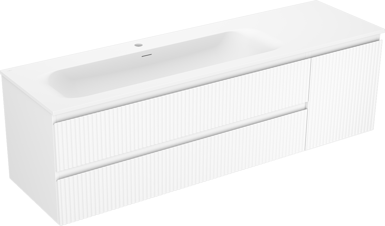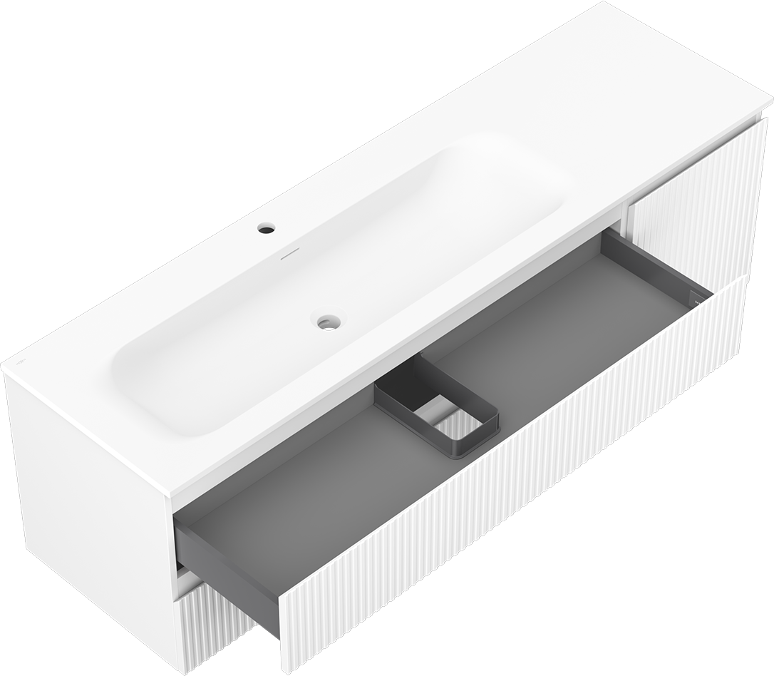 Decupajul în sertar este proiectat în așa fel încât să acomodeze sifonul, care este esențial în instalațiile de lavoare. Datorită acestui fapt, mobila poate fi montată complet funcțională, fără a fi necesară renunțarea la spațiul din sertar în favoarea instalației.