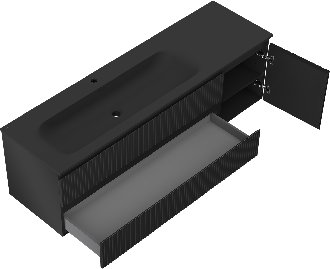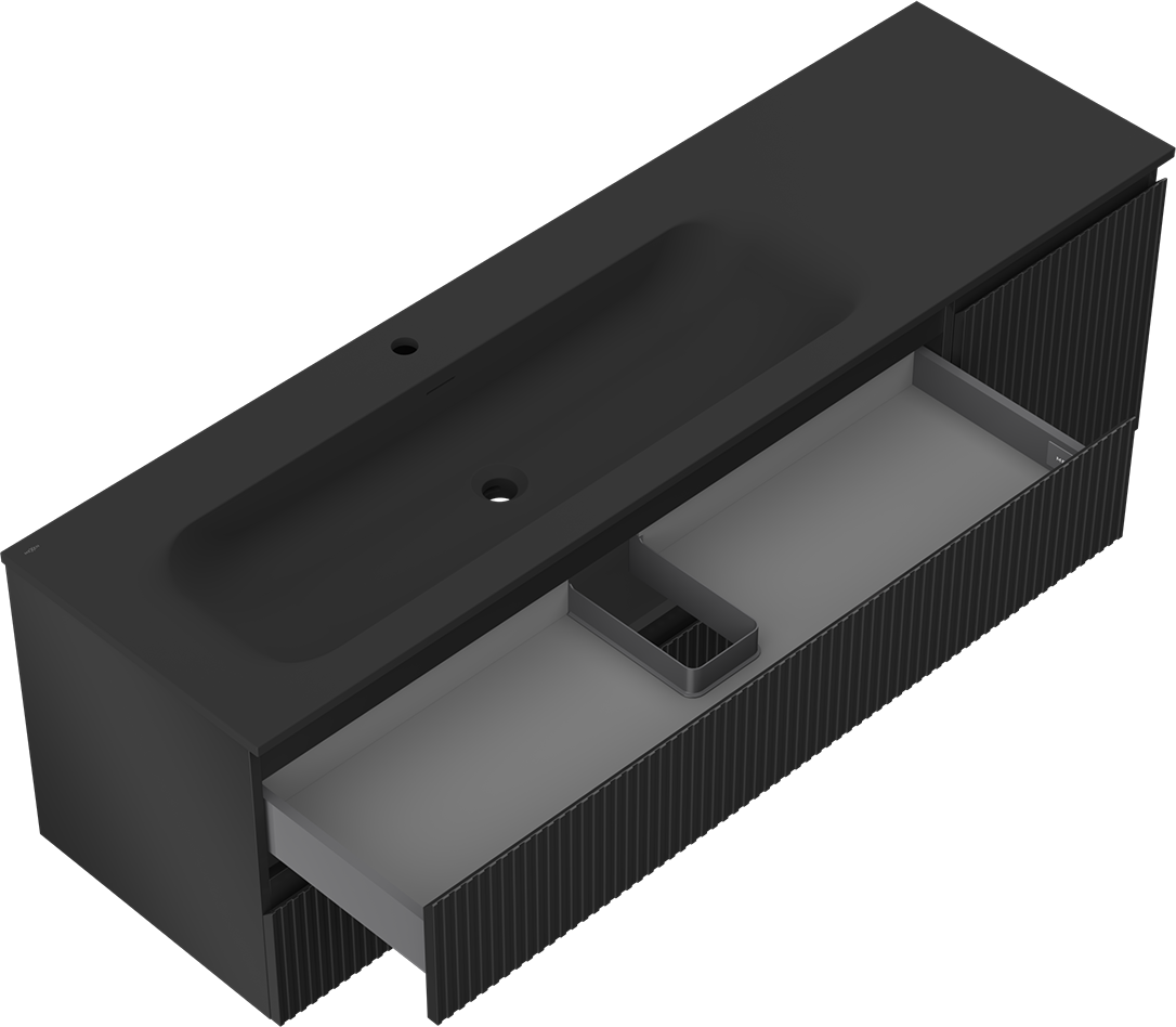 Decupajul în sertar este proiectat în așa fel încât să acomodeze sifonul, care este esențial în instalațiile de lavoare. Datorită acestui fapt, mobila poate fi montată complet funcțională, fără a fi necesară renunțarea la spațiul din sertar în favoarea instalației.