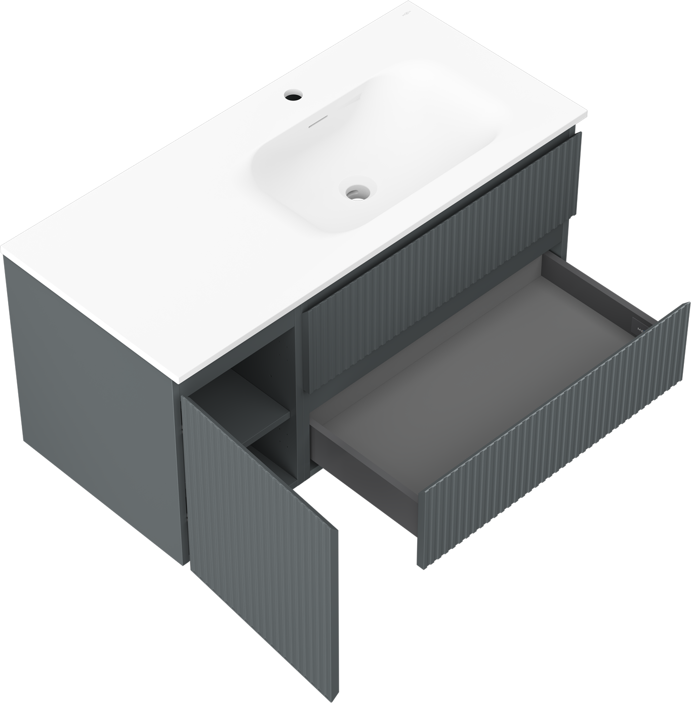 Decupajul în sertar este proiectat în așa fel încât să acomodeze sifonul, care este esențial în instalațiile de lavoare. Datorită acestui fapt, mobila poate fi montată complet funcțională, fără a fi necesară renunțarea la spațiul din sertar în favoarea instalației.