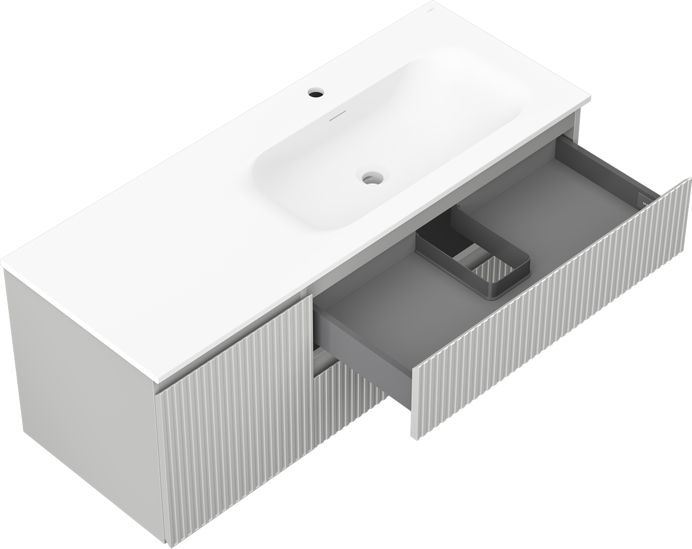 Decupajul în sertar este proiectat în așa fel încât să acomodeze sifonul, care este esențial în instalațiile de lavoare. Datorită acestui fapt, mobila poate fi montată complet funcțională, fără a fi necesară renunțarea la spațiul din sertar în favoarea instalației.