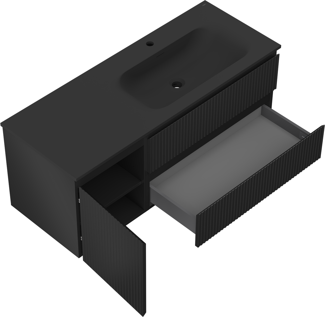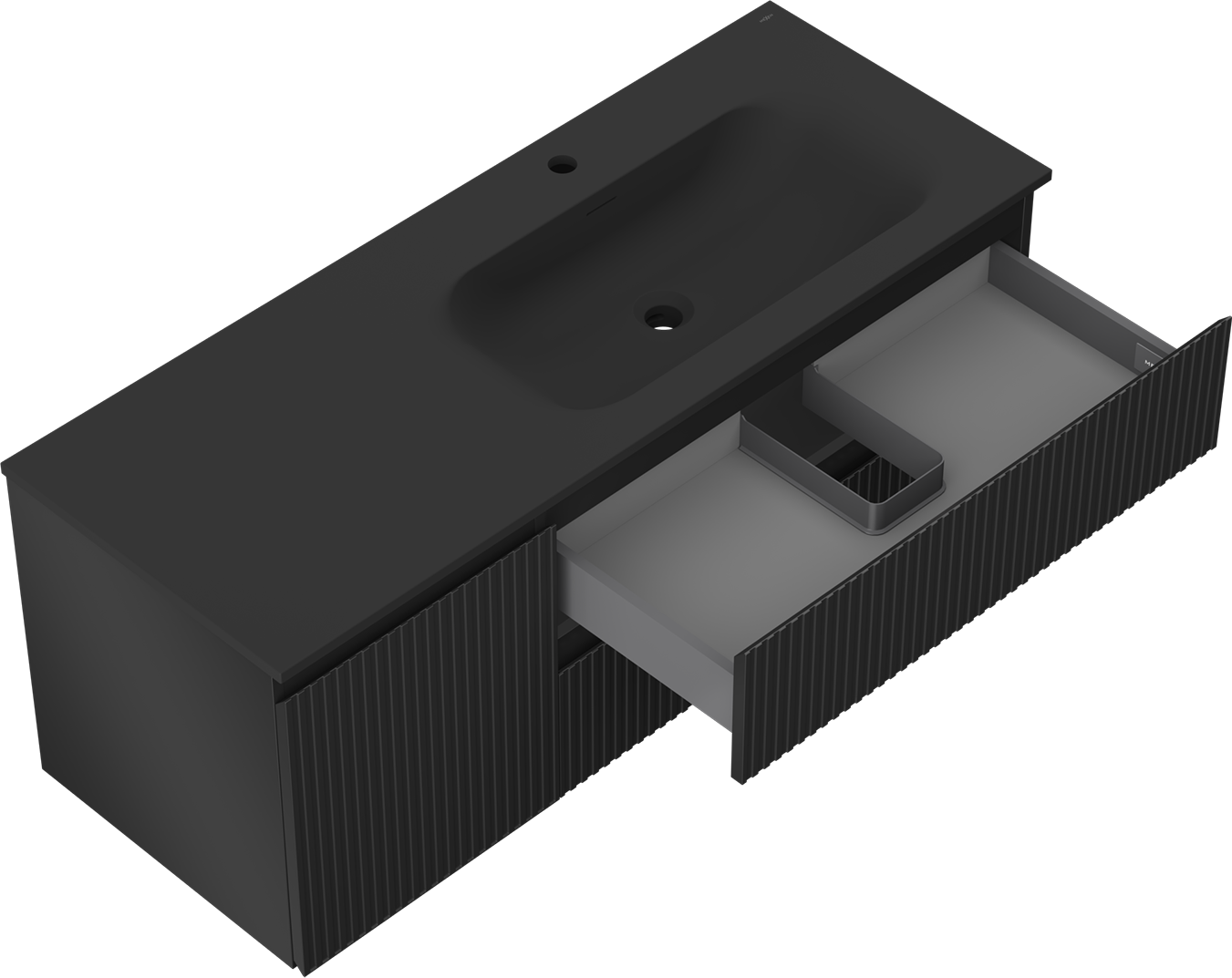 Decupajul în sertar este proiectat în așa fel încât să acomodeze sifonul, care este esențial în instalațiile de lavoare. Datorită acestui fapt, mobila poate fi montată complet funcțională, fără a fi necesară renunțarea la spațiul din sertar în favoarea instalației.