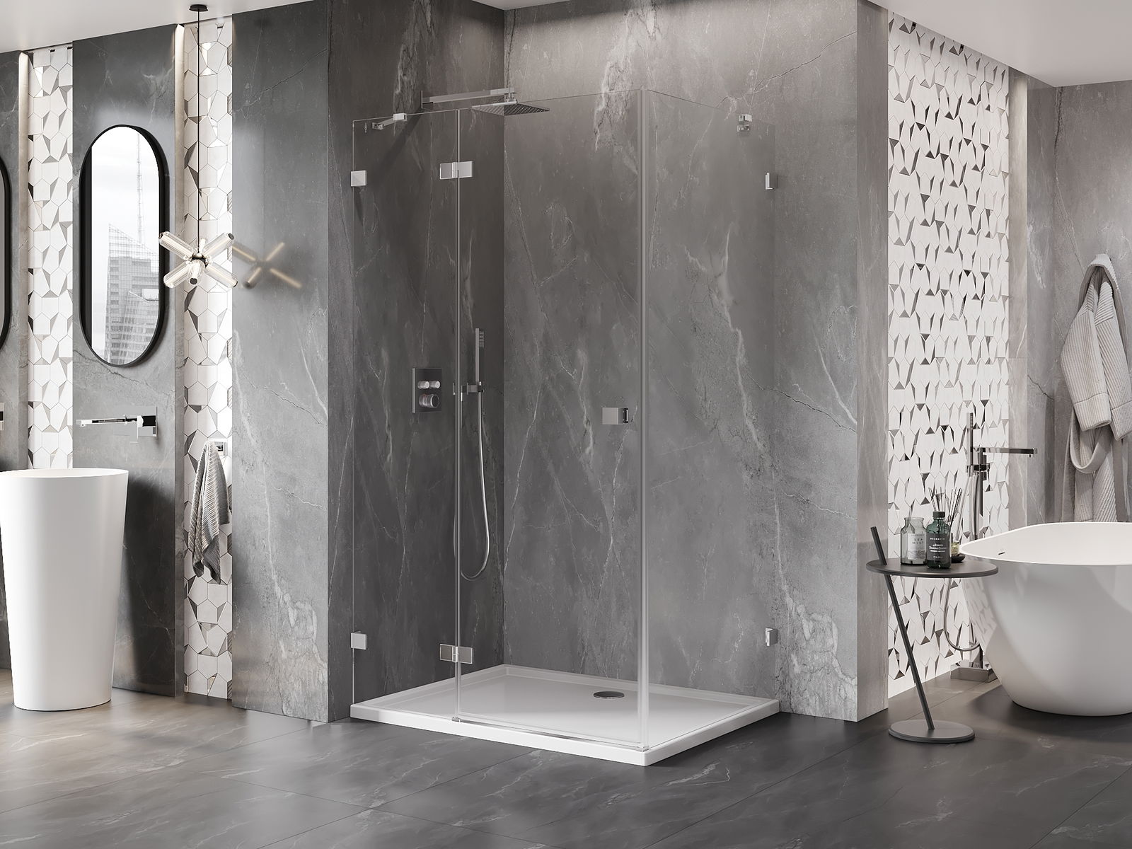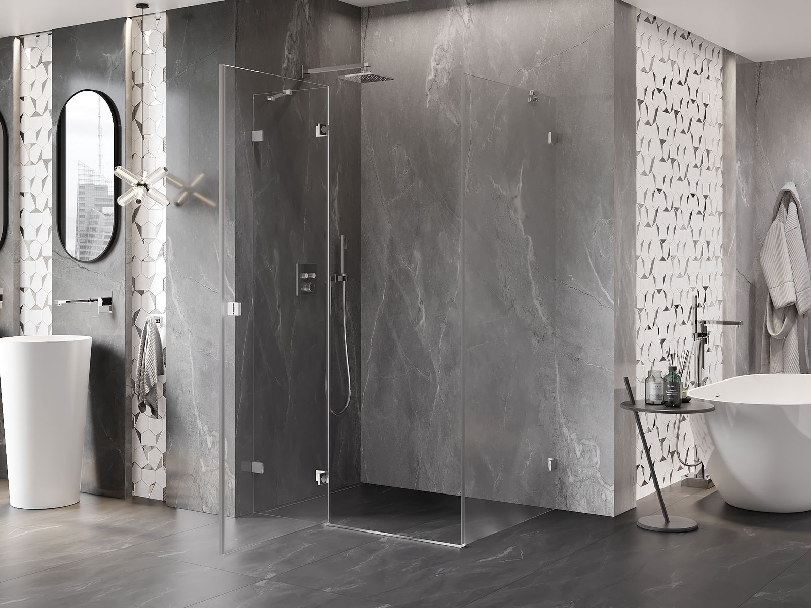 Mânerul practic și confortabil este realizat din metal durabil și rezistent. Forma modernă, combinată cu un finisaj asortat cu culoarea profilelor, conferă un aspect modern și elegant întregului, subliniind estetica fiecărei băi.
