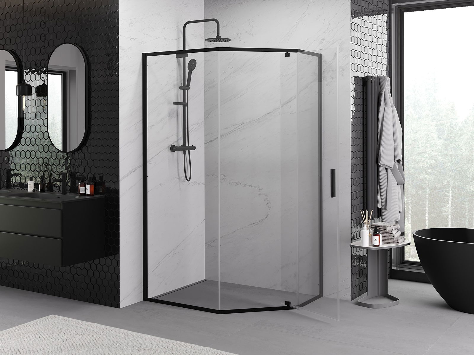 Mexen Exo cabina de duș pentagonală cu ușă oscilantă 100 x 90 cm, transparentă, neagră - 812-100-090-70-00