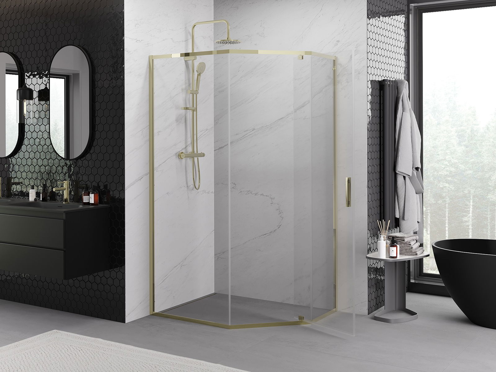 Mexen Exo cabina de duș pentagonală batantă 90 x 80 cm, transparentă, aurie - 812-090-080-50-00