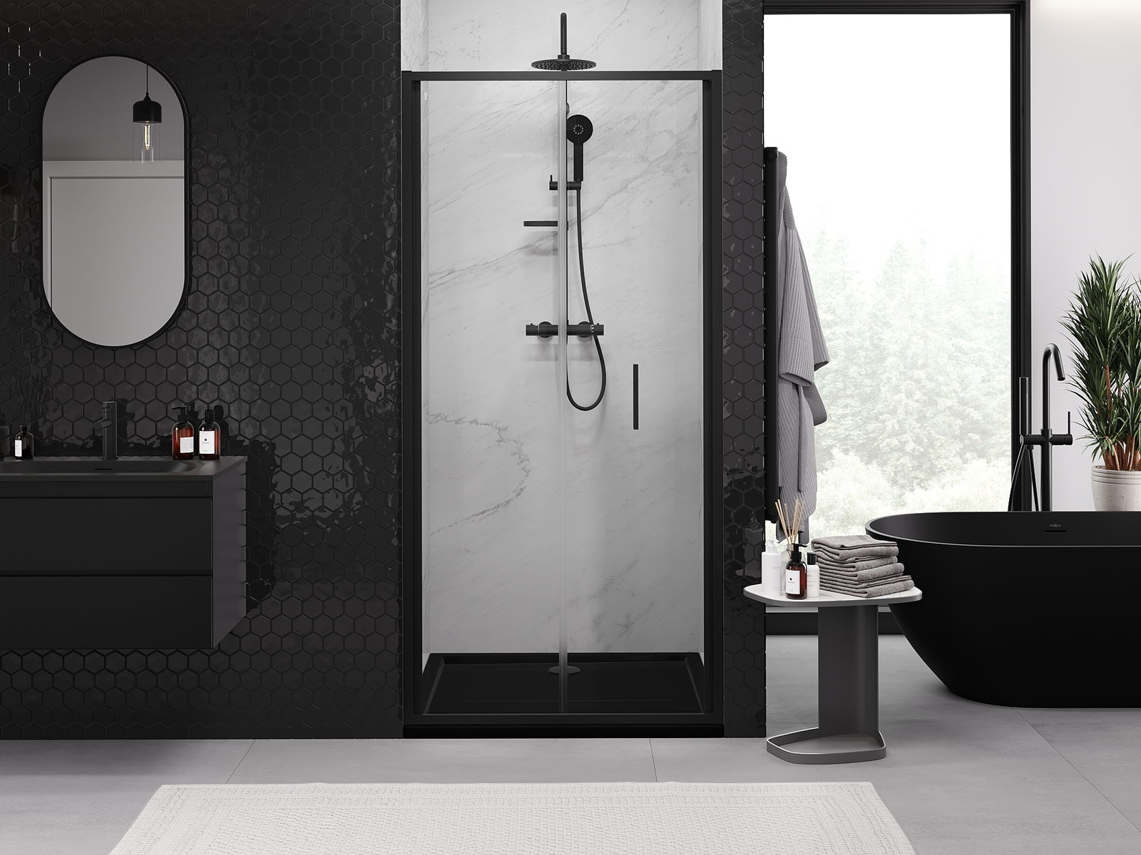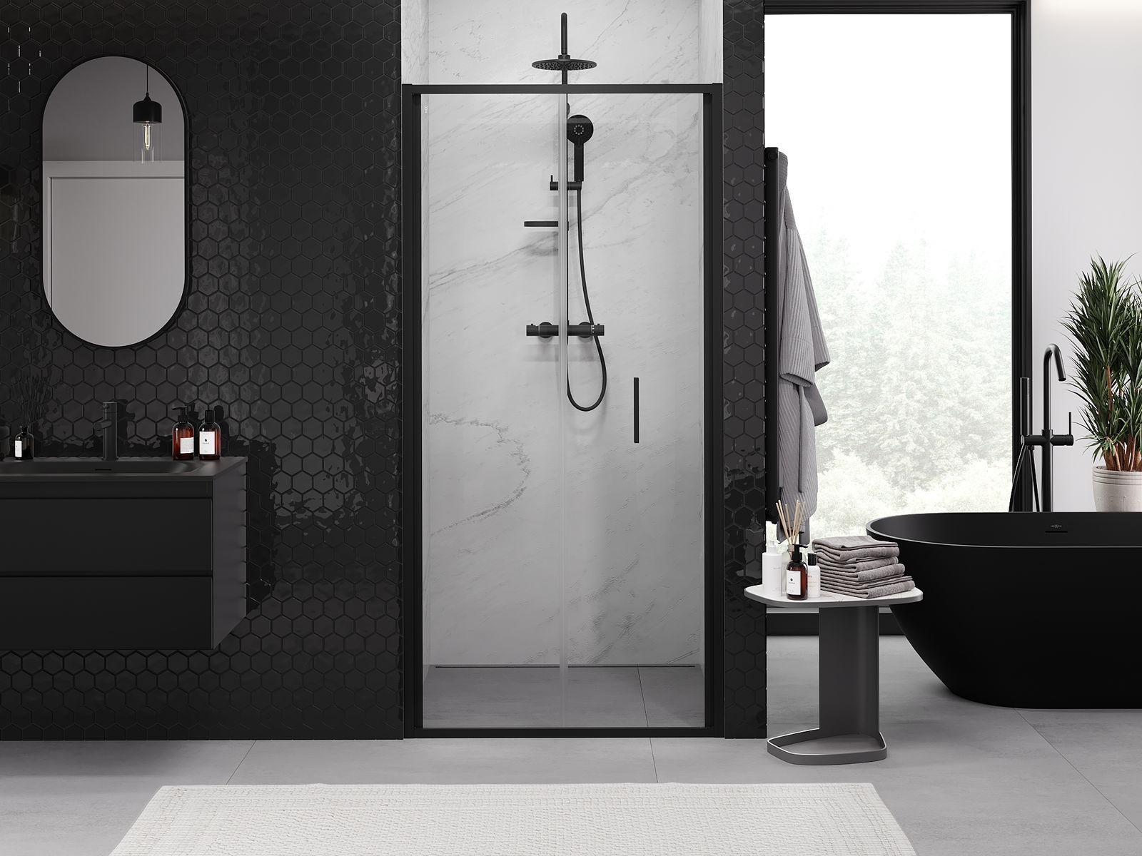 Mânerul practic și confortabil este realizat din metal durabil și rezistent. Forma modernă, combinată cu un finisaj asortat cu culoarea profilelor, conferă un aspect modern și elegant întregului, subliniind estetica fiecărei băi.