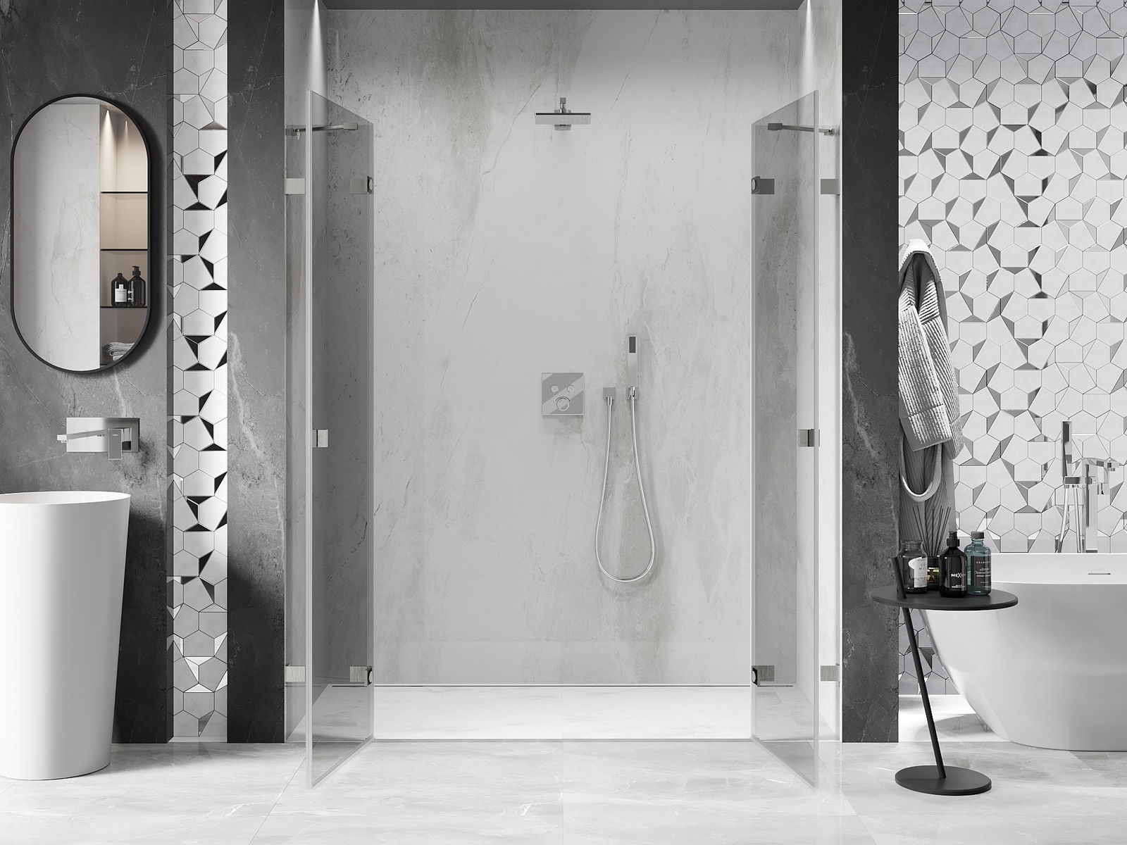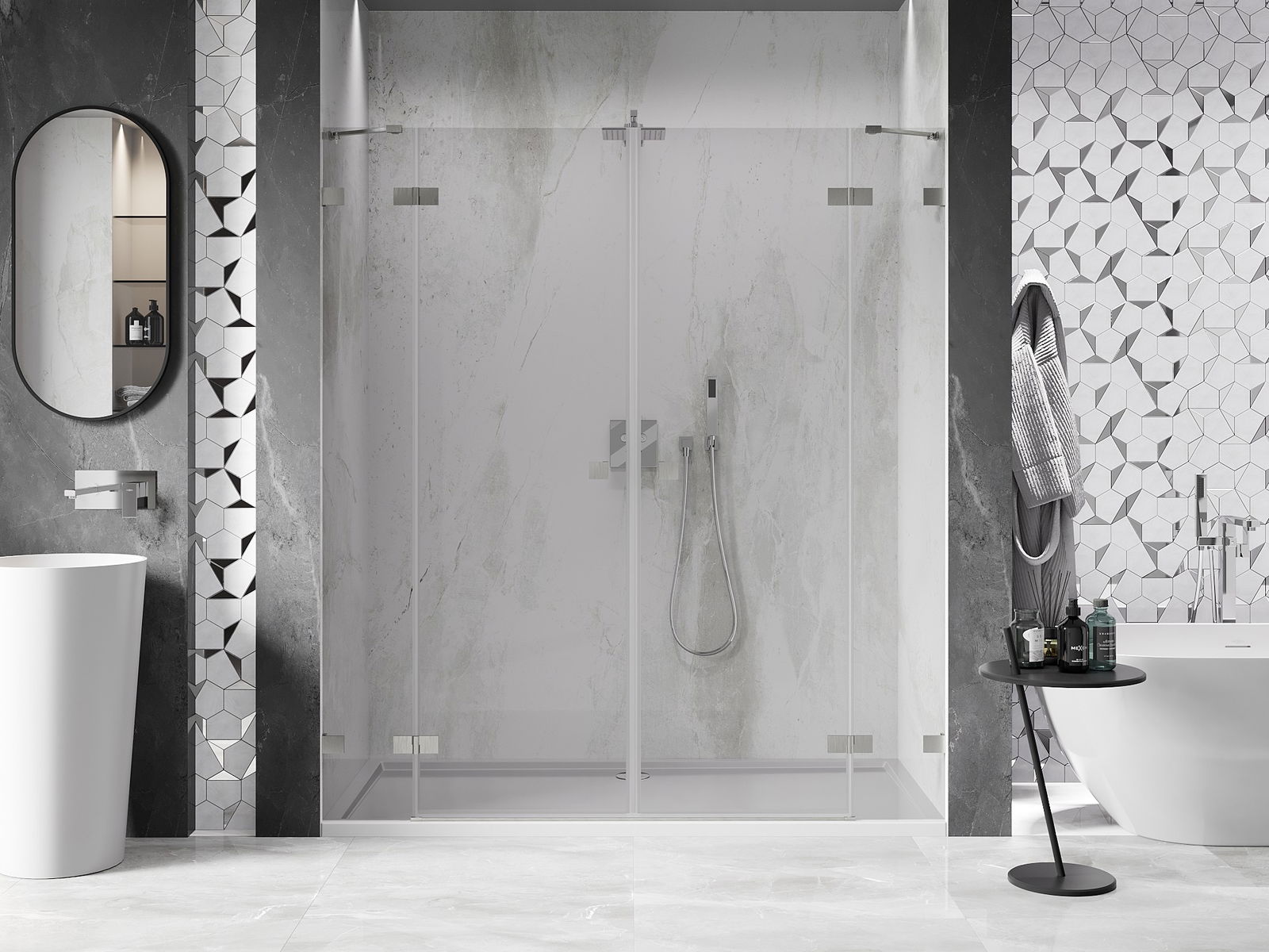 Mânerul practic și confortabil este realizat din metal durabil și rezistent. Forma modernă, combinată cu un finisaj asortat cu culoarea profilelor, conferă un aspect modern și elegant întregului, subliniind estetica fiecărei băi.