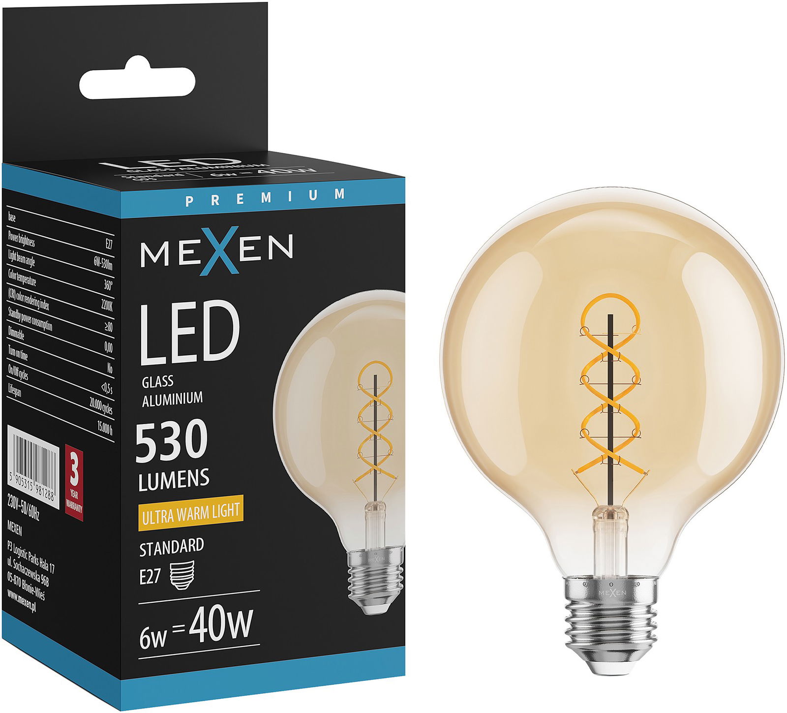 Mexen Vintis Bec filament spirală LED E27, G95, 6W, Caldă - 2200K, 530 lm, chihlimbar - L167-E27-0622-50