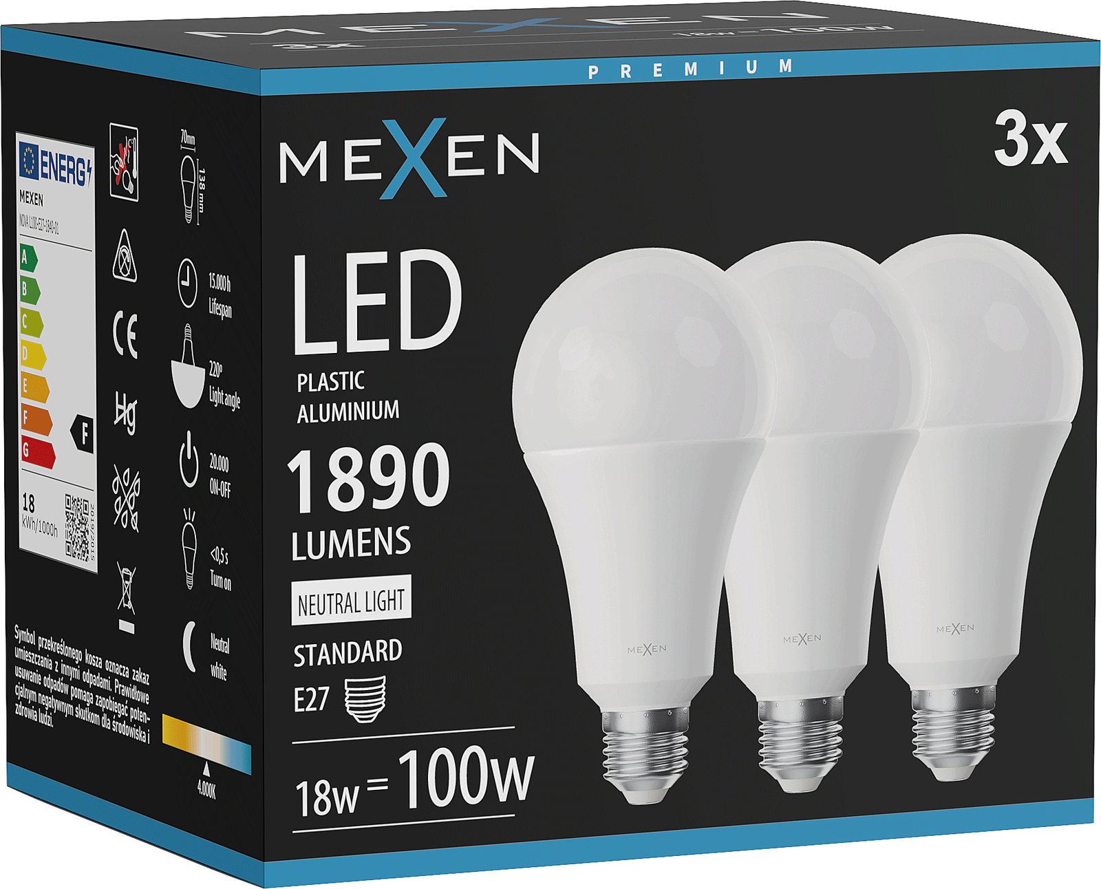 Mexen Nova 3x Bec LED E27, A70, 18W, Neutră - 4000K, 1890 lm - L100-E27-1840-01x03