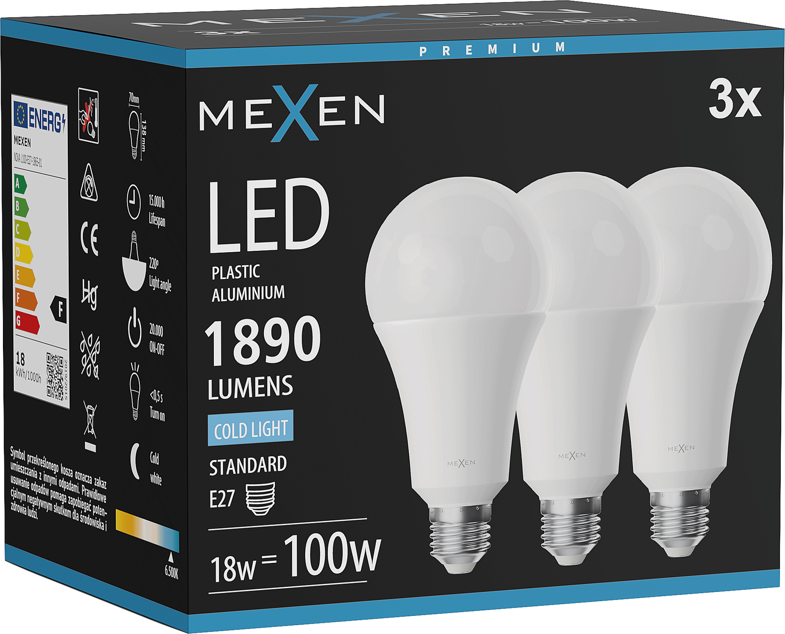 Mexen Nova 3x Bec LED E27, A70, 18W, Rece - 6500K, 1890 lm - L100-E27-1865-01x03