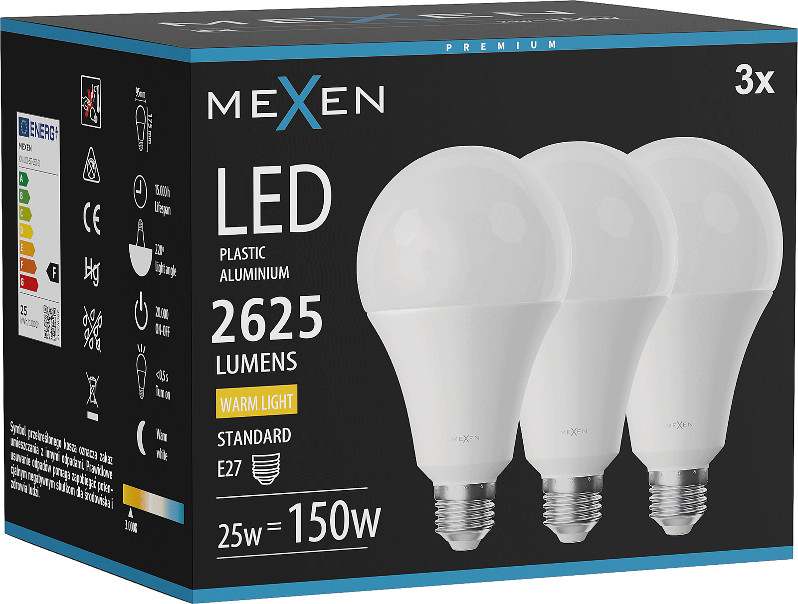 Mexen Nova 3x Bec LED E27, A95, 25W, Caldă - 3000K, 2625 lm - L100-E27-2530-01x03