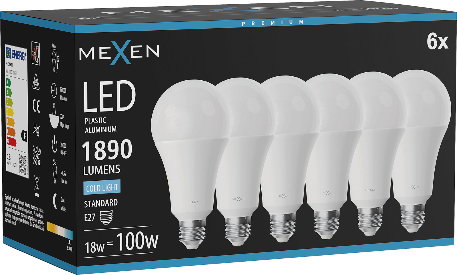 Mexen Nova 6x Bec LED E27, A70, 18W, Rece - 6500K, 1890 lm - L100-E27-1865-01x06
