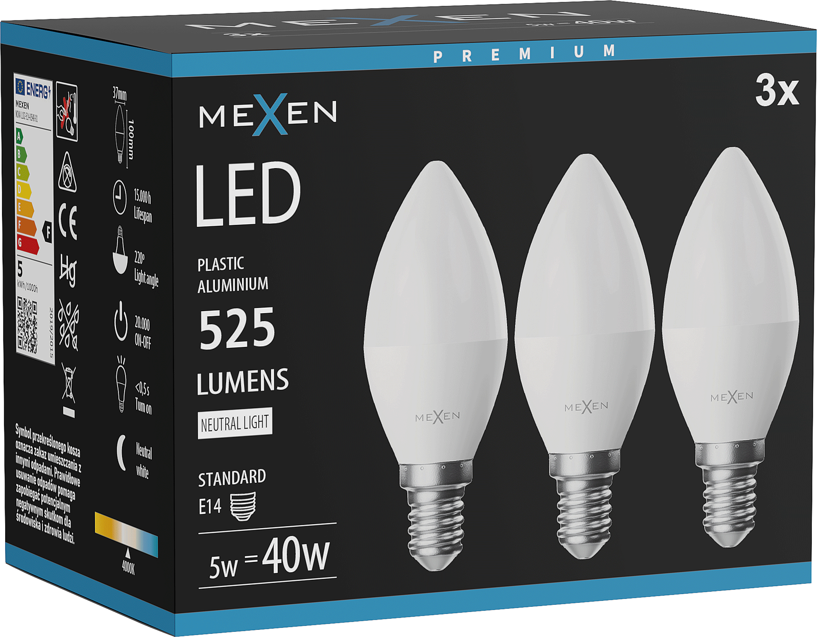 Mexen Nova 3x Bec LED E14, C37, 5W, Neutru - 4000K, 525 lm - L102-E14-0540-01x03