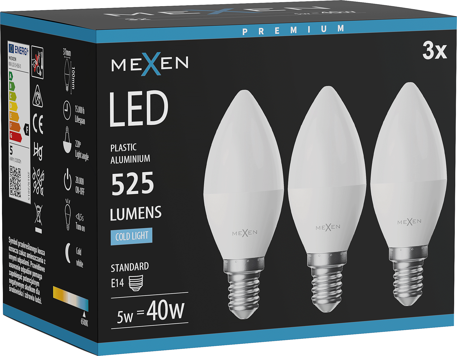 Mexen Nova 3x Bec LED E14, C37, 5W, Rece - 6500K, 525 lm - L102-E14-0565-01x03