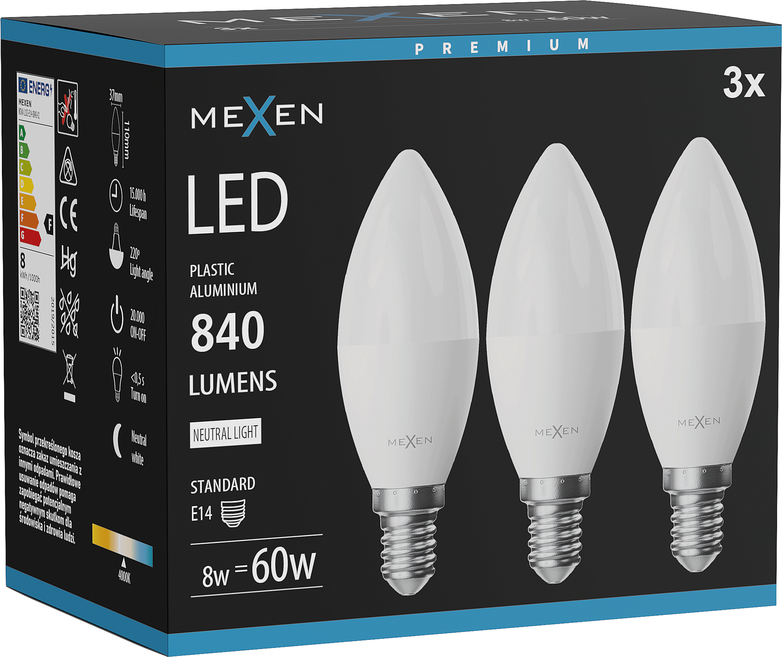 Mexen Nova 3x Bec LED E14, C37, 8W, Neutru - 4000K, 840 lm - L102-E14-0840-01x03