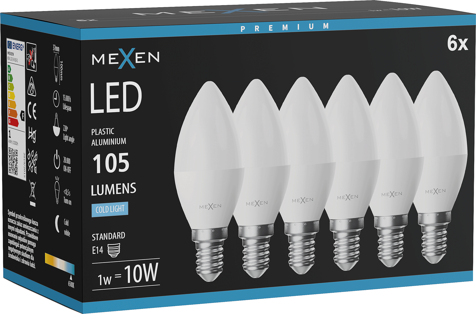 Mexen Nova 6x Bec LED E14, C37, 1W, Rece - 6500K, 105 lm - L102-E14-0165-01x06