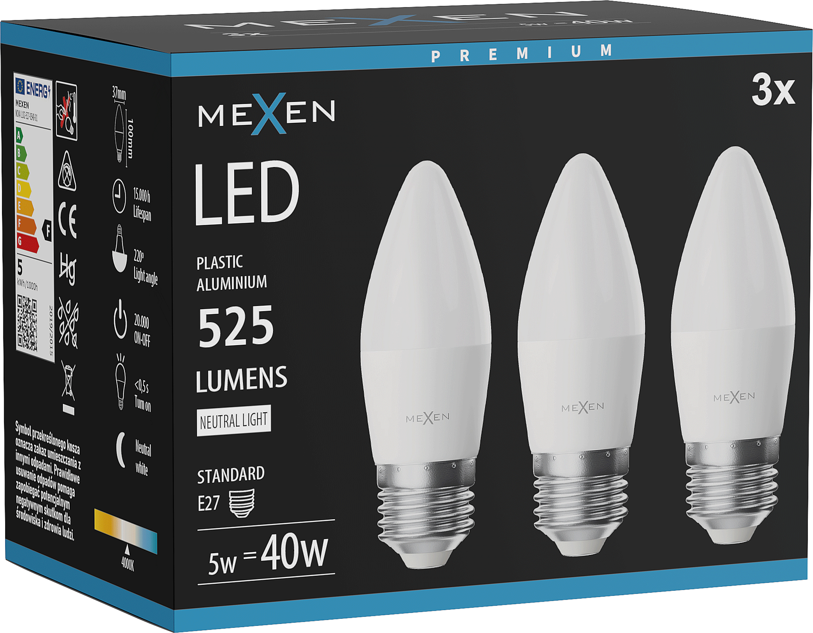Mexen Nova 3x Bec LED E27, C37, 5W, Neutru - 4000K, 525 lm - L102-E27-0540-01x03