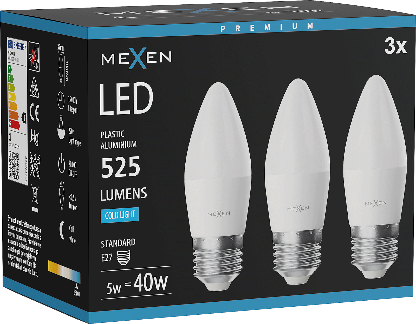 Mexen Nova 3x Bec LED E27, C37, 5W, Rece - 6500K, 525 lm - L102-E27-0565-01x03