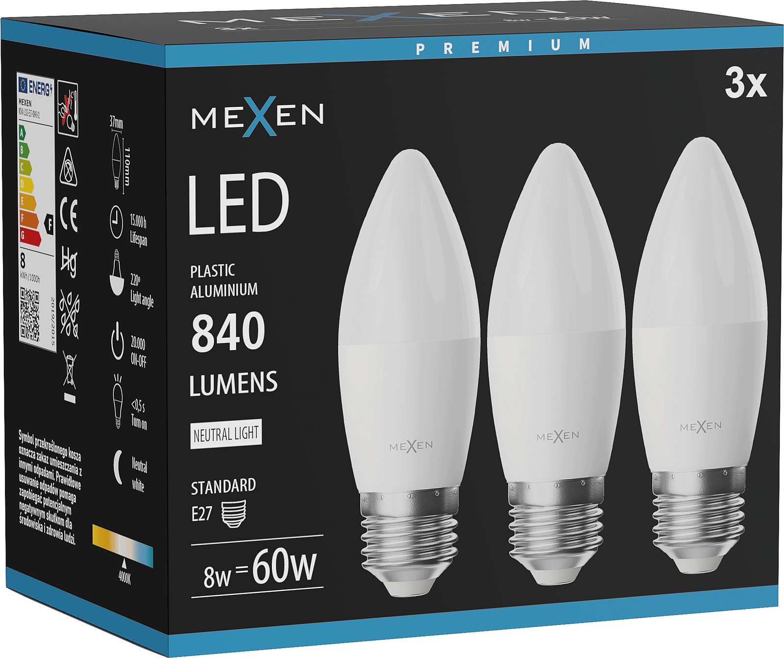 Mexen Nova 3x Bec LED E27, C37, 8W, Neutru - 4000K, 840 lm - L102-E27-0840-01x03