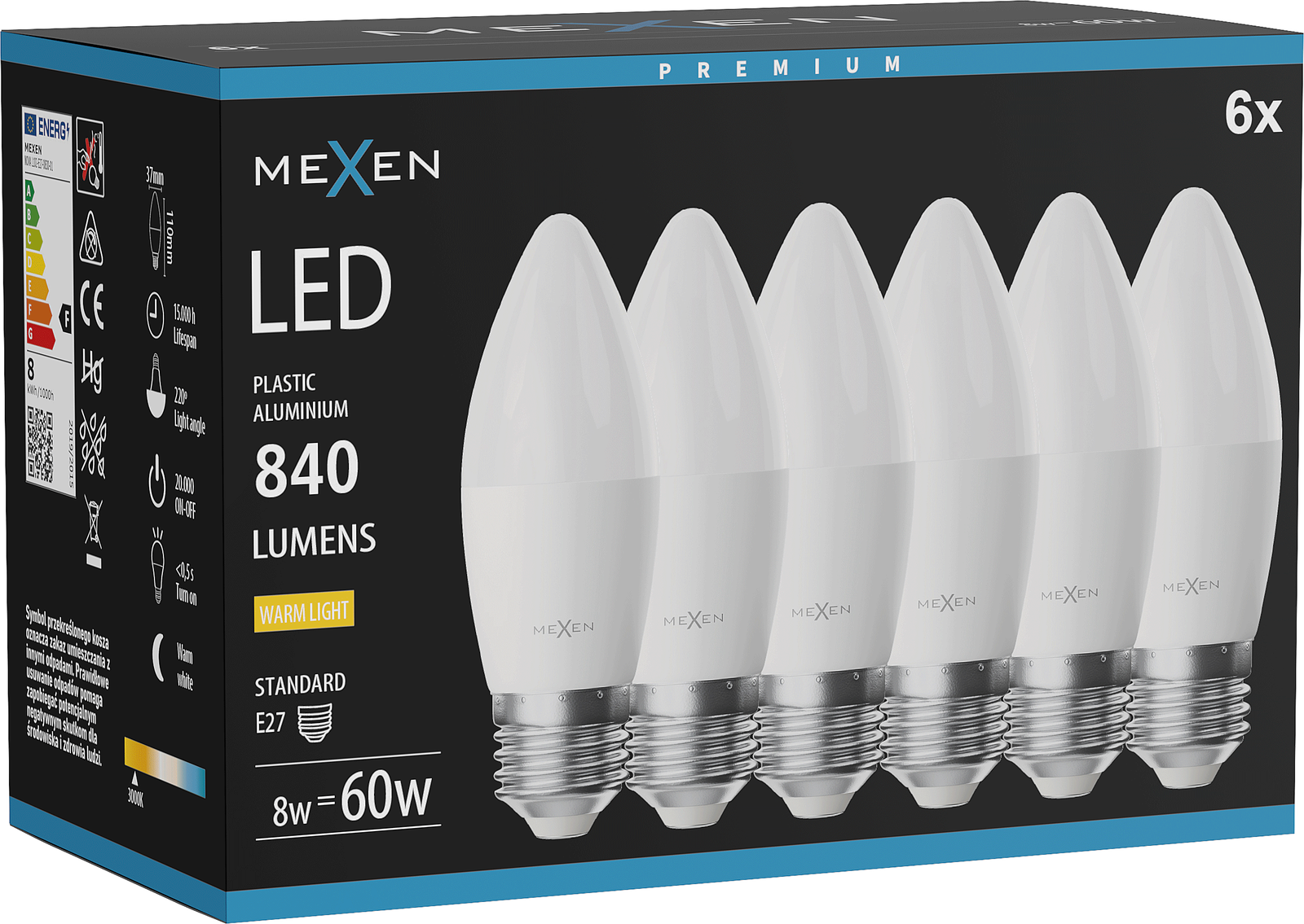 Mexen Nova 6x Bec LED E27, C37, 8W, Caldă - 3000K, 840 lm - L102-E27-0830-01x06