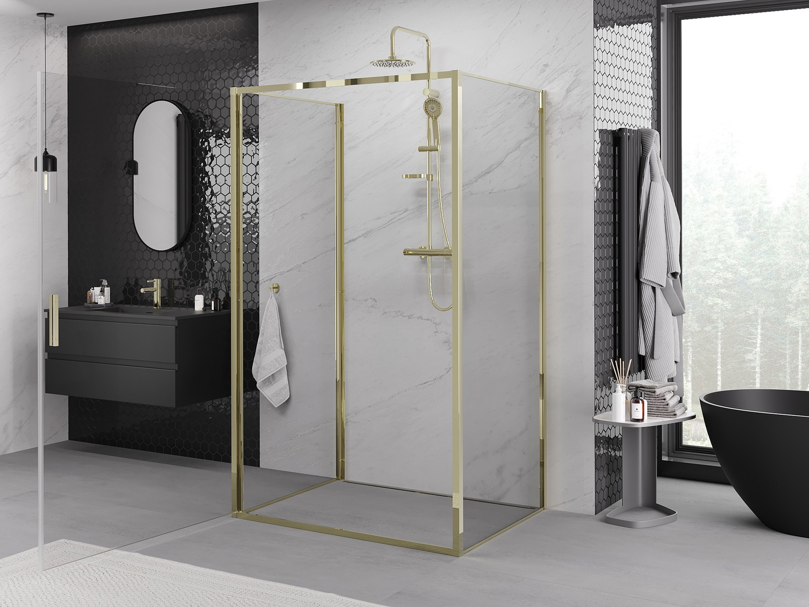 Mânerul practic și confortabil este realizat din metal durabil și rezistent. Forma modernă, combinată cu un finisaj asortat cu culoarea profilelor, conferă un aspect modern și elegant întregului, subliniind estetica fiecărei băi.