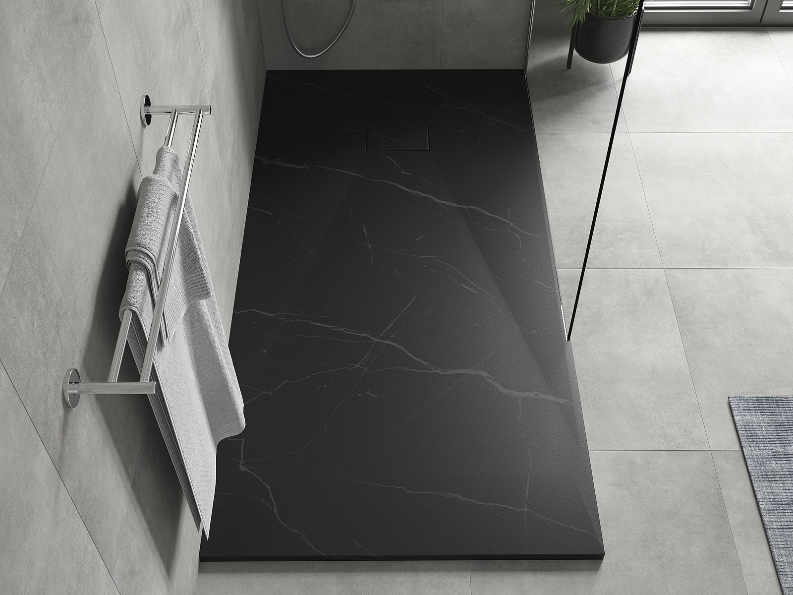 Mexen Hugo este o rece glisantă dreptunghiulară în culoarea pietrei negre, cu dimensiuni impresionante de 180x90 cm, realizată din material durabil SMC. Construcția sa ultraplată permite montajul atât în pardoseală, cât și pe pardoseală, oferind flexibilitate mare în amenajare. Structura bogată a pietrei și modelul unic îi conferă un aspect deosebit. Datorită posibilității de a tăia recea, aceasta poate fi adaptată perfect la orice baie. Rezistența ridicată la lovituri garantează durabilitatea, iar sifonul integrat curățabil de sus și diametrul de evacuare de 90 mm asigură confortul utilizării. Capacitatea în culoarea pietrei negre completează designul modern al produsului.