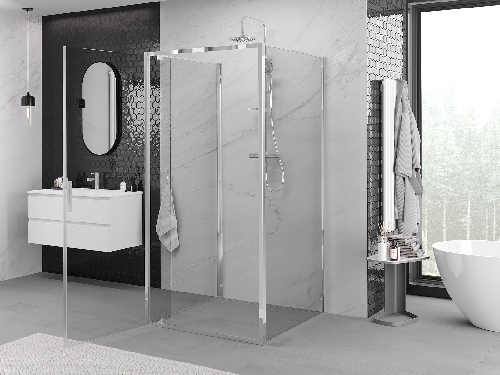 Mânerul practic și confortabil este realizat din metal durabil și rezistent. Forma modernă, combinată cu un finisaj asortat cu culoarea profilelor, conferă un aspect modern și elegant întregului, subliniind estetica fiecărei băi.
