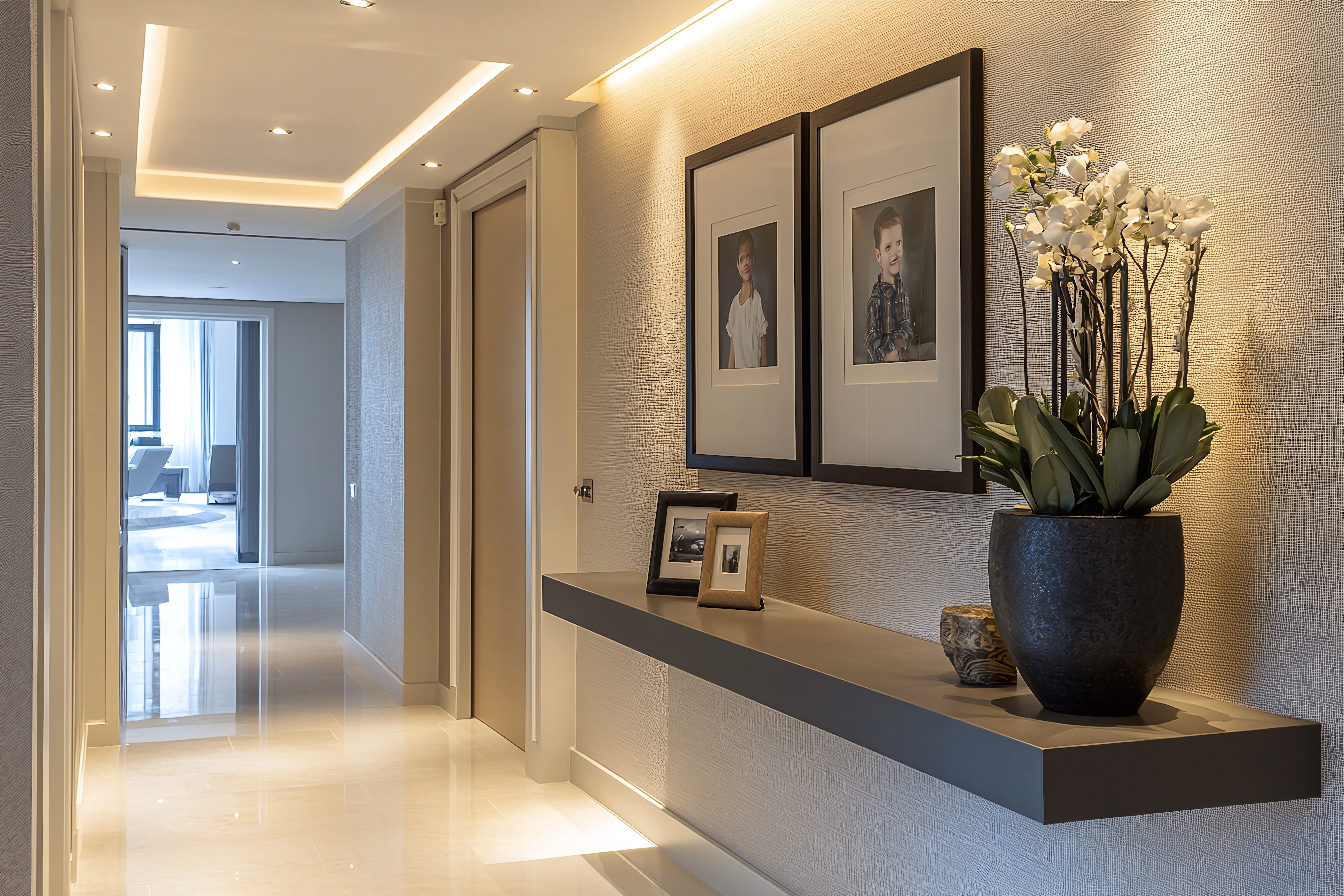- Metrajul și dispunerea — într-un hol lung, o singură lustră nu este suficientă. Pentru a evita zonele întunecate, distribuiți punctele de lumină uniform pe întreaga lungime a tavanului.