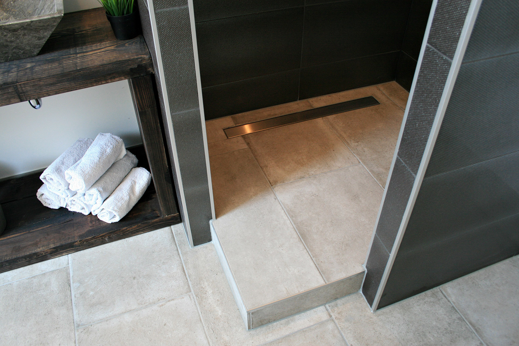 Finalizarea operei va fi fixarea plăcilor potrivite care în acest caz nu doar că îndeplinesc o funcție decorativă, ci și practică. Pentru podeaua dușului echipată cu scurgere liniară, merită să alegi plăci de clasă III sau IV de uzură – aceste produse nu sunt poroase, nu absorb apă și au proprietăți antiderapante. Alegerea chitului nu ar trebui să fie la întâmplare – produsul adecvat pentru aceste soluții este chitul epoxidic, care este mai elastic, mai dur și mai rezistent la deteriorare decât chitul de ciment.