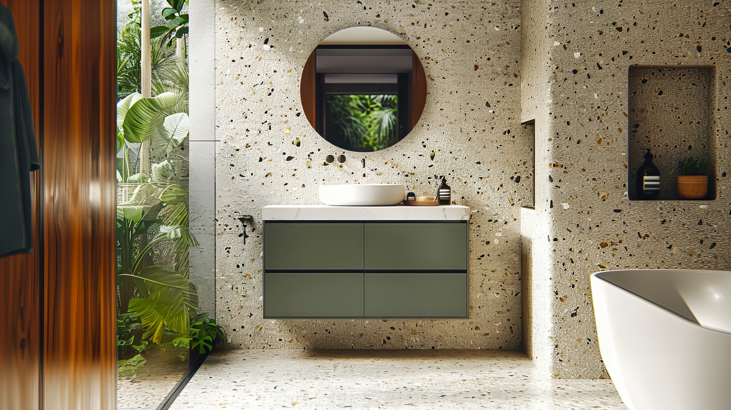 Posibilitățile de utilizare a acestui motiv sunt aproape nelimitate. Pe lângă acoperirile clasice pentru pereți și podele, terrazzo arată fantastic ca blat sub chiuvetă sau învelitoare de design pentru cadă/designerska Materialul se potrivește atât în băi mici, cât și în mari, iar datorită versatilității sale, se va integra perfect în multe stiluri de amenajare, atât clasice, cât și moderne,